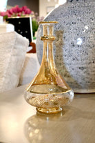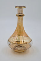 Elegant yellow glass decanter featuring a striking 12-inch height with a sophisticated gold etched band detail. Perfect for serving wine, whiskey, or spirits with timeless style. The classic design complements any home bar or dining setting. Durable glass construction with a secure stopper keeps contents fresh and protected. An ideal gift for collectors and entertaining enthusiasts.