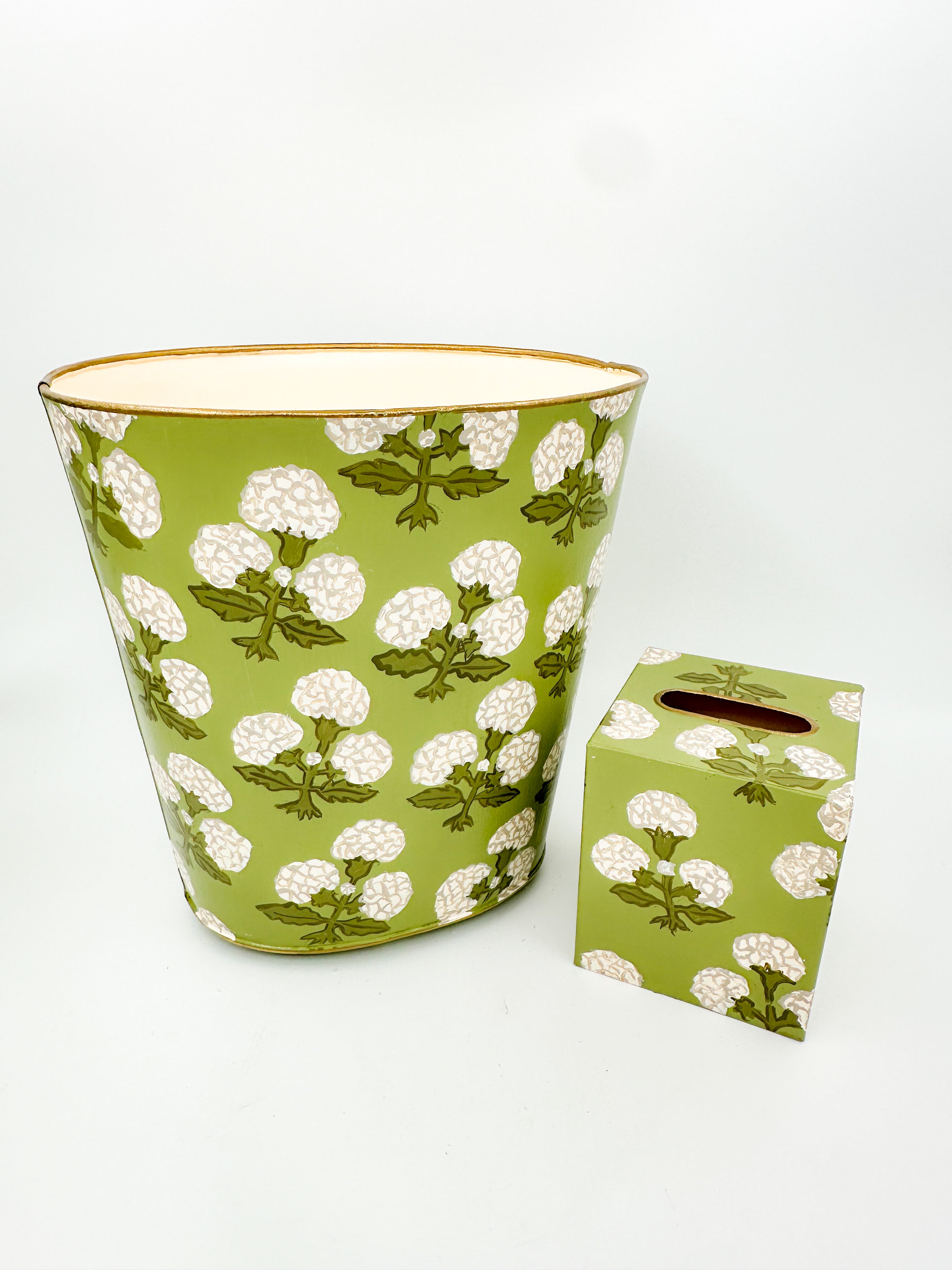 The Sage Hydrangea Collection features a hand-painted waste basket and Kleenex cover adorned with elegant hydrangea and sage motifs. Designed to complement Bassett McNab wallpaper, these pieces bring a refined touch of nature-inspired artistry to your space. Ideal for adding subtle sophistication and cohesive style to any room, they combine functionality with timeless beauty.