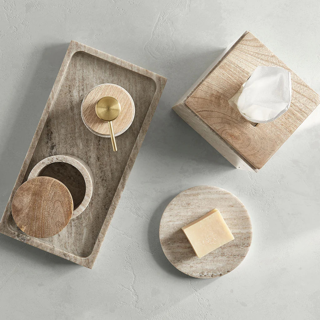 Crafted from natural marble and featuring mango wood accents, this beige-toned collection adds a modern-meets-earthly delights appeal to any spa.