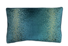 It’s a rectangular decorative pillow with a rich, deep teal base color. The surface has a textured, almost speckled pattern that transitions from darker tones on the edges to lighter, more golden-green highlights toward the center and upper area. The effect looks somewhat metallic or shimmering, giving the pillow a luxurious, modern look. The edges are softly rounded, and the overall style feels elegant and contemporary—something you’d likely see in upscale home décor settings.