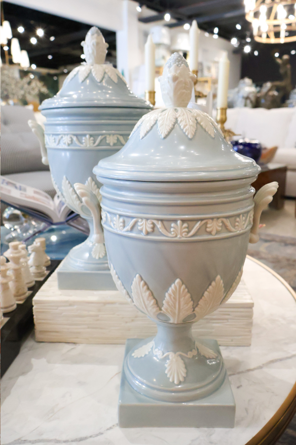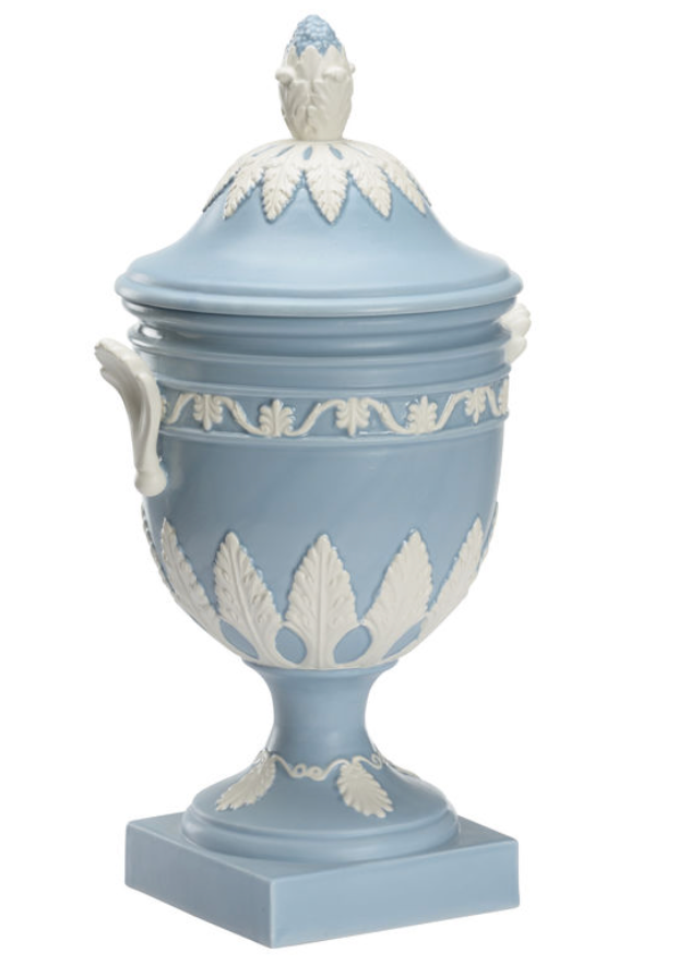 Elevate your interior aesthetic with our distinguished Wedgewood Urn. This refined decorative vessel showcases an elegant blue/grey and white palette, gracefully supported by a tasteful footed base. Its sophisticated proportions of 16.5 x 9.5 x 9.5 inches create a statement piece that commands attention while maintaining timeless appeal.