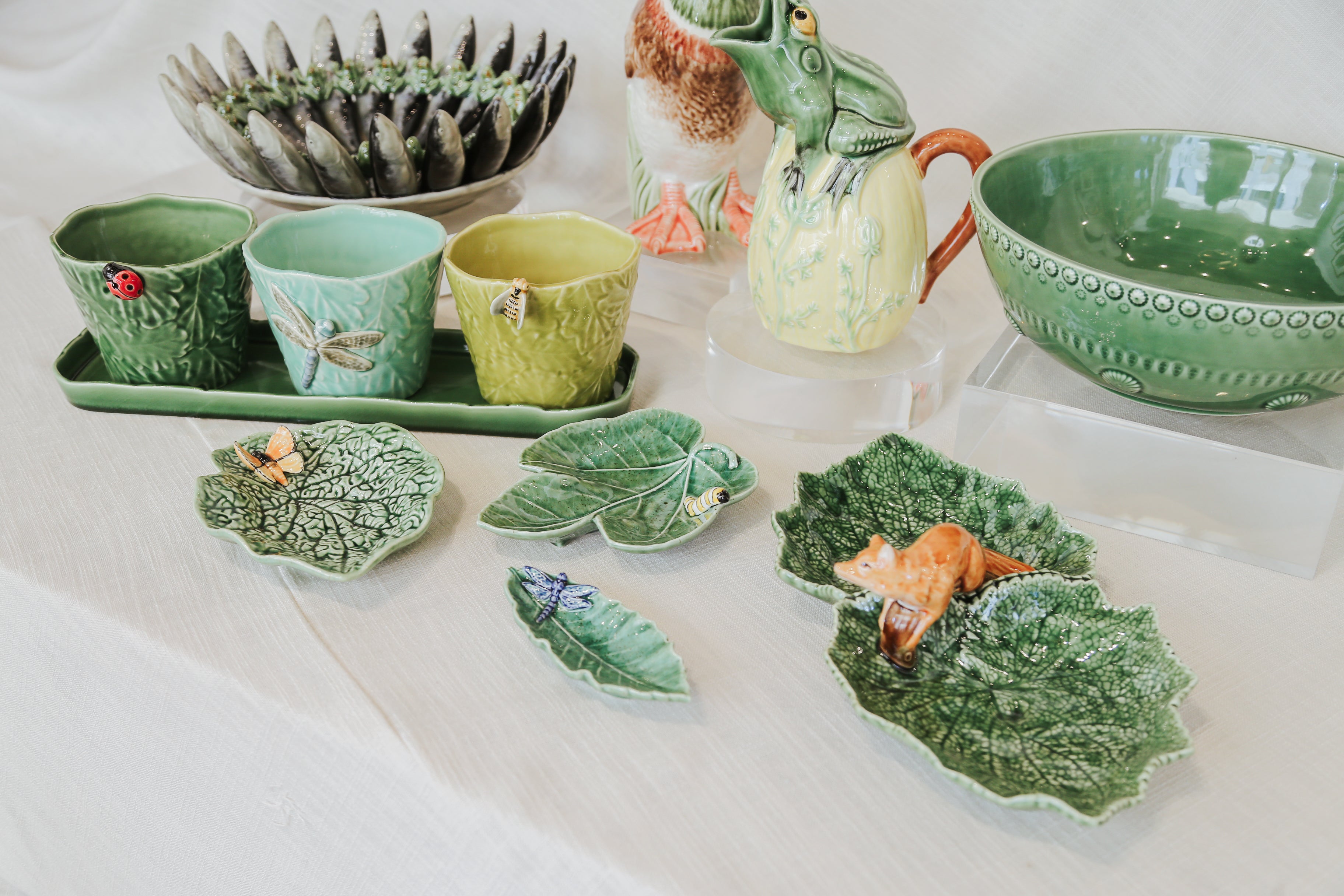 In 1884, he and his son founded an eponymous factory in Caldas da Rainha along the Portuguese coast to create whimsical and naturalistic faience pieces based on his art. Because of the special minerals in the local soil and the skills of the craftsmen in the area, Caldas da Rainha is well-known as the capital of Portuguese pottery. Today the factory takes Pinheiro's original style into the 21st century with satirical portraits of modern day celebrities, while continuing its old fashioned, made by hand tradition of Portuguese pottery making.
