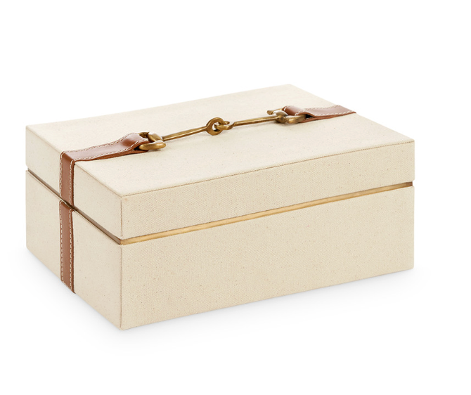 The Buckley Rectangular Box commands attention with its daring mix of refined materials and bold design. Wrapped in sleek canvas, it boasts a striking top-stitched leather ribbon centered by an antique brass horse bit for a powerful equestrian statement. Inside, soft microsuede and a brass trim create an opulent sanctuary for your valuables, while the felted bottom protects your surfaces. Sized perfectly at 12W x 9D x 5.75H, it’s a fearless fusion of style and function designed to elevate any space and complement the Buckley and Toulon Collections.