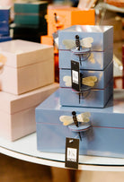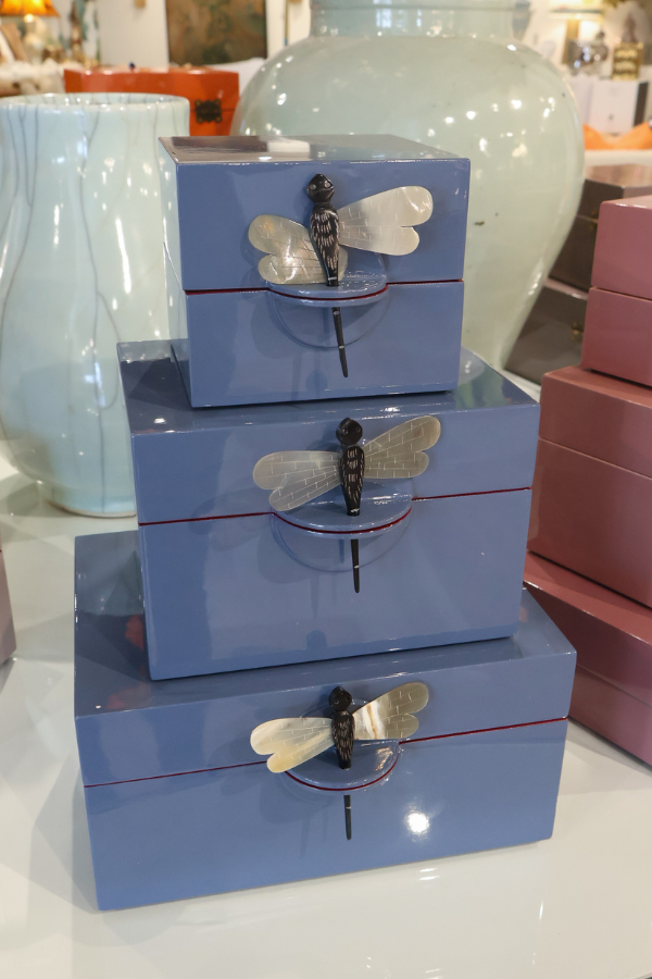 Each box in this collection is made with MDF wood covered in 13-15 layers of lacquer with a dragonfly pin closure with buffalo horn.