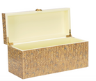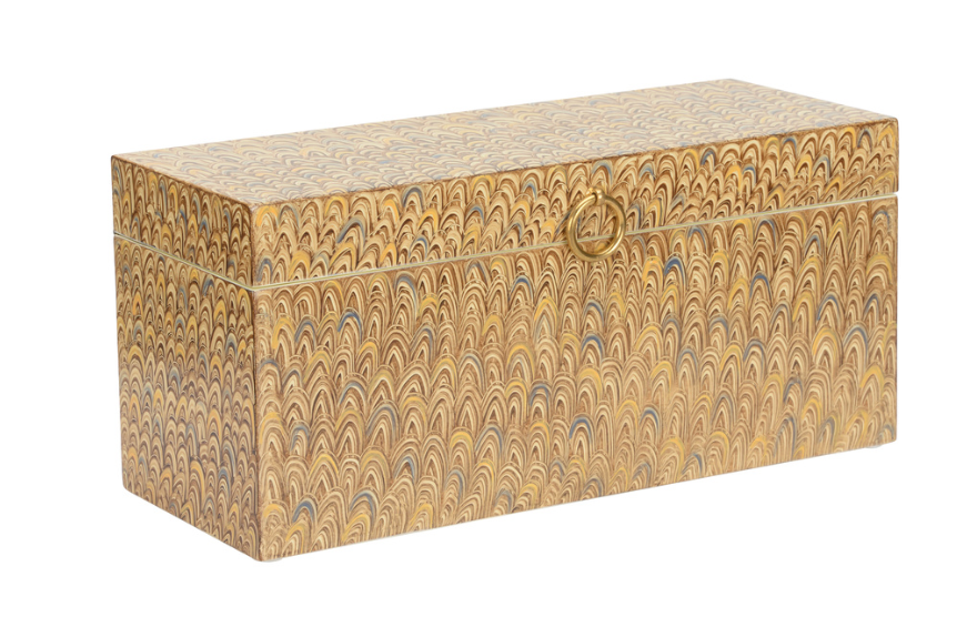 Discover timeless elegance with this handcrafted Tanzin Box, a rectangular hinged treasure designed by Bill Cain. Each piece showcases a distinctive hand-painted marble pattern with luxurious gold hardware—a graceful ring handle and refined hinges that elevate any space. Measuring 7"H x 15"W x 6"D, this versatile box serves as both practical storage for jewelry and keepsakes and a sophisticated decorative accent. Whether gracing a vanity, dresser, or coffee table, its artisanal craftsmanship and refined aesthetic bring understated luxury to your home. Available in rich Red, Green, and Brown marble finishes.