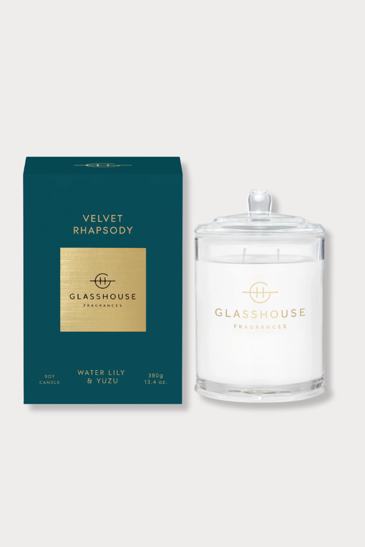 WHAT IT ISThe cascading petals of jasmine, juicy yuzu citrus, and water lily of Glasshouse Fragrances' Velvet Rhapsody candle are a tribute to fruits and aquatic florals that conjure a garden idyll after rain. Extravagantly celebrate the bounty and enchantment of a secret garden, with birds and unfurling blooms as beautiful to the eye as to the senses. Burn time: up to 80 hours. 13.4 oz. Made in Australia.TOP NOTES