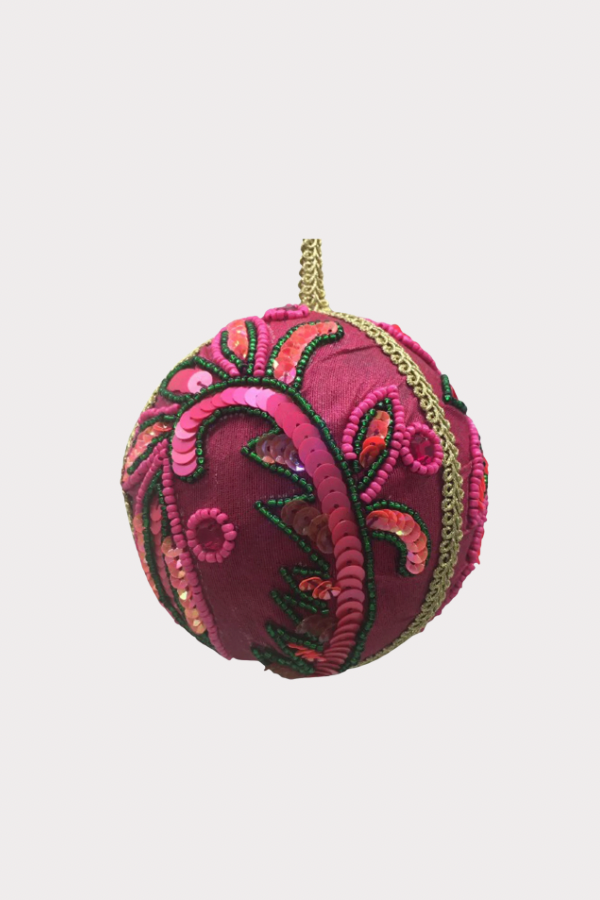 Bring a burst of color and texture to your holiday decorations with this fuchsia velvet ornament. Adorned with sparkling gold and green sequins and delicate beaded accents, it adds a playful and luxurious touch to your tree or festive display. Perfect for those who love a vibrant and whimsical holiday vibe!