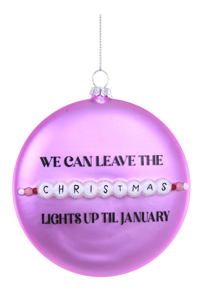 Add a little holiday cheer and Taylor Swift fandom to your tree with our 25-Christmas Lights Ornament. Featuring the lyrics "leave the lights on until January" from Taylor's hit song, this ornament will keep your tree shining bright all season long!