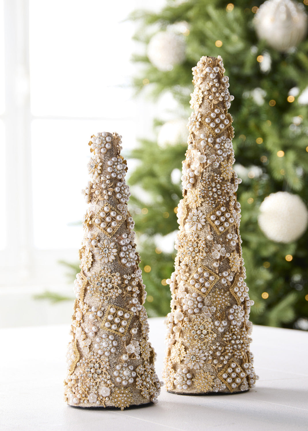 Add a touch of whimsy to your space with these gold jewel and pearl brooch topiary trees. Available in two charming sizes, they sparkle with elegant gems and delicate pearls, creating a playful yet sophisticated centerpiece. Perfect for brightening up any room or occasion with a dash of dazzling fun.