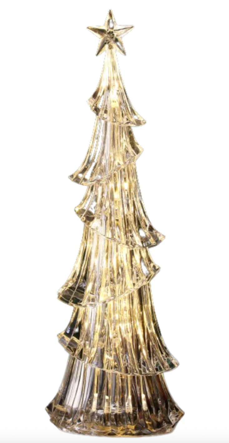Illuminate your holiday space with this elegant acrylic Christmas tree, standing 16 inches tall with a sturdy 5 by 4-inch base. Adorned with numerous warm LED lights on each branch and crowned with a shining star, it creates a cozy glow throughout the season. Powered by three AAA batteries or an optional adapter (sold separately), it offers convenience with timer and remote control features. This sophisticated decoration blends classic charm with modern ease to enhance your festive ambiance.