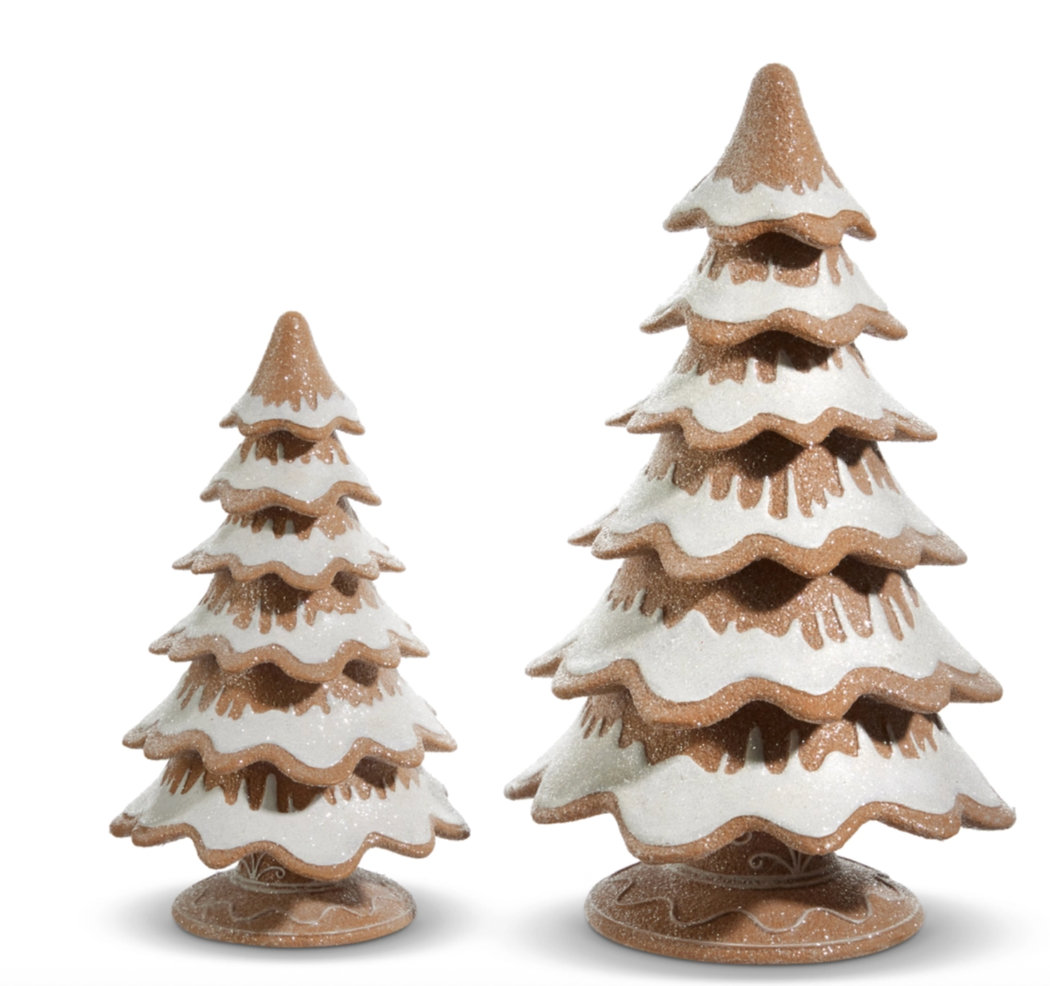Bring holiday cheer with these playful gingerbread Christmas trees! Crafted from durable resin, each tree adds a sweet touch to your décor. Available as a set of two in warm brown tones, they measure 8.75"D x 14"H and 6.5"D x 10"H. Sold separately, these delightful trees are perfect for mixing and matching festive vibes around your home.