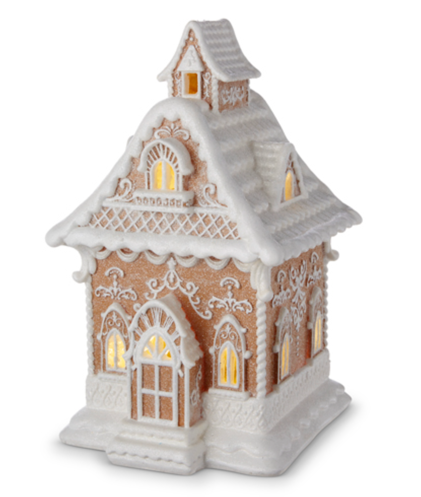 Bring festive cheer to your space with this 13" Lighted Gingerbread House. Crafted from durable resin in warm brown tones, it measures a charming 8" long by 8.75" wide and stands 13" tall. The cozy glow requires just 3 AA batteries, making it the perfect delightful decoration to brighten up any holiday setting.
