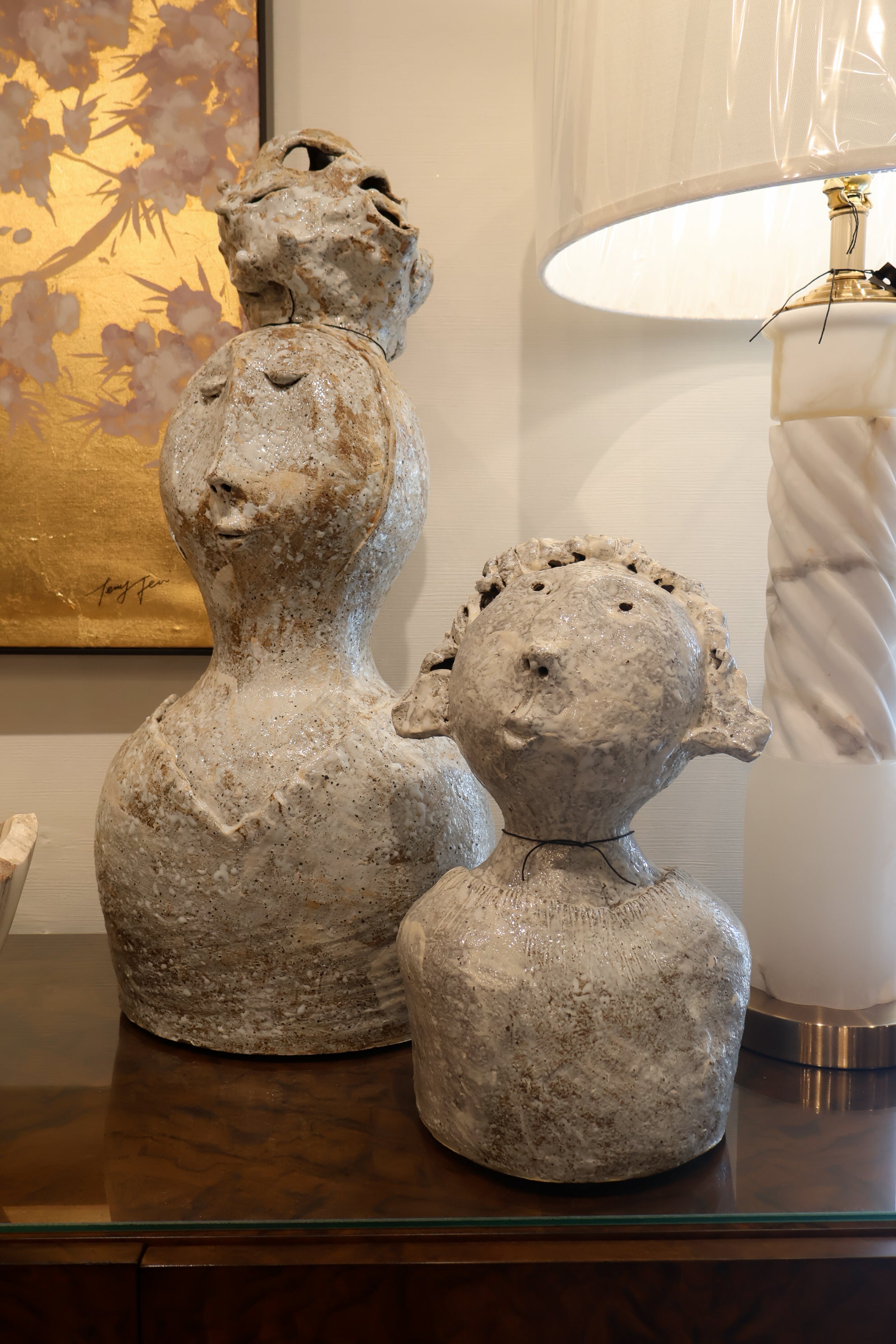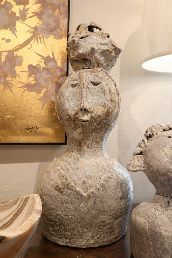 From the Arjan Deng Collection: a stunning, whitish-glazed terracotta female bust adorned with a unique wedding headdress. Standing at 28 inches tall and 14 inches wide, this sculpture is a must-have for any art lover's collection!
