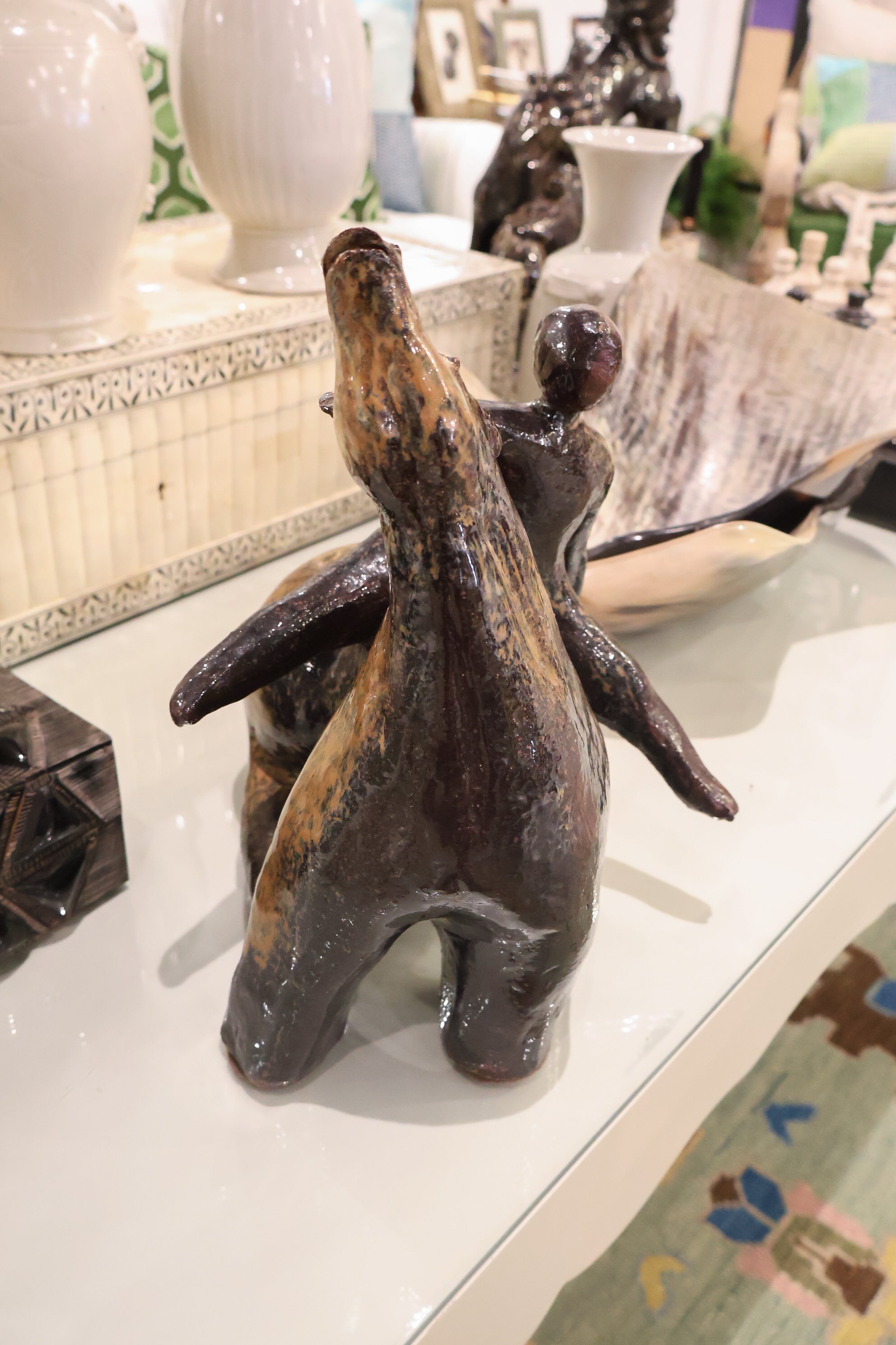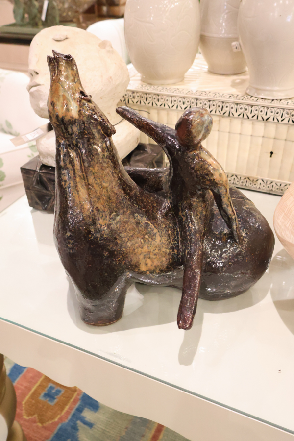 Introducing Equus, a stunning glazed ceramic statue depicting a man on horseback. Created by a Holocaust survivor, this masterpiece stands at 12 inches tall, with dimensions of 12 inches in depth and 11 inches in width. A testament to resilience and strength, this artistic creation will add an elegant touch to any space.