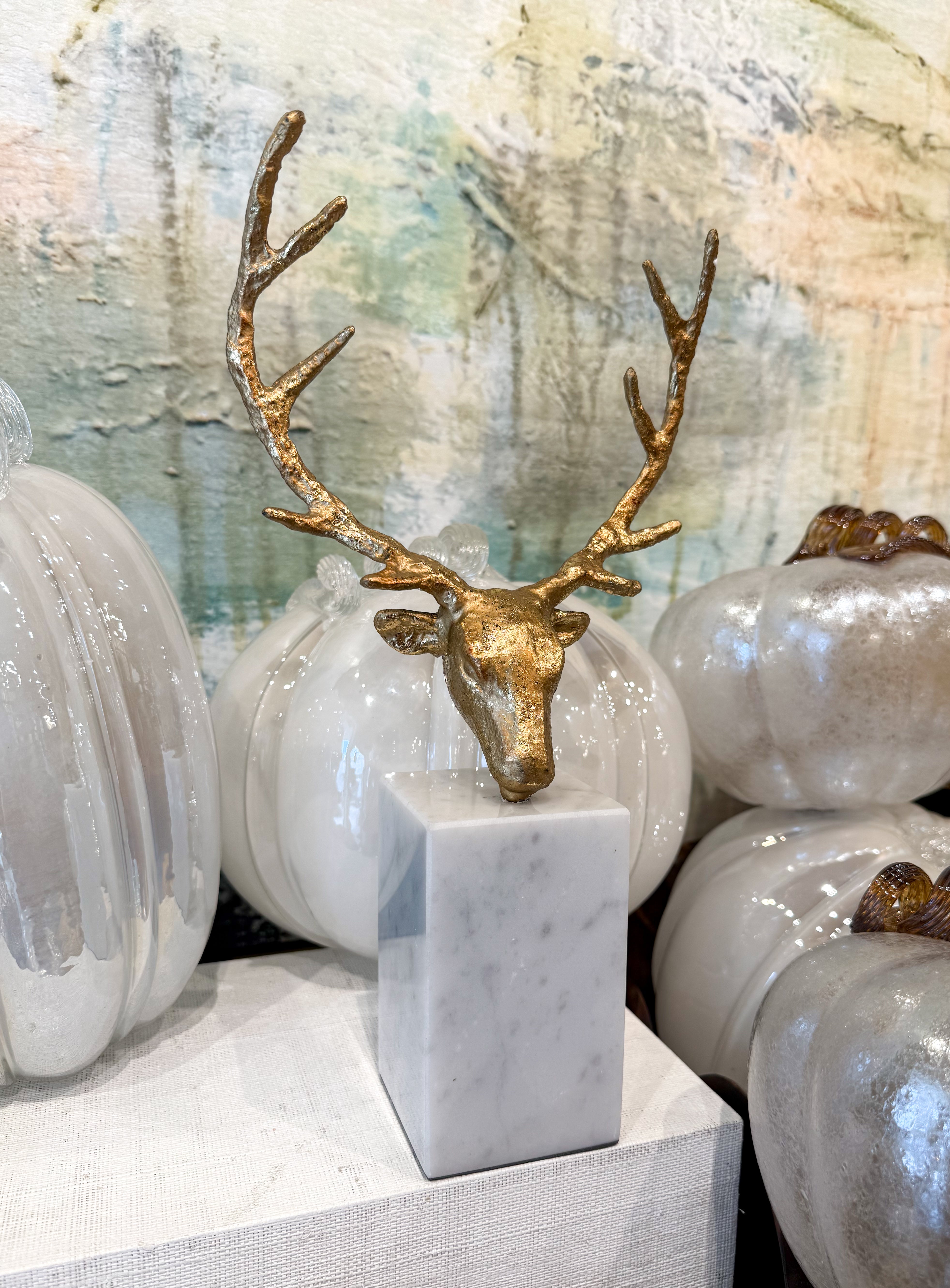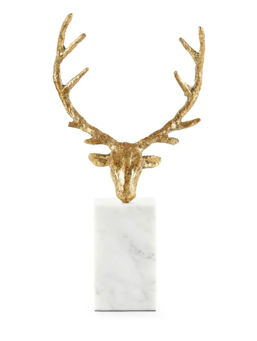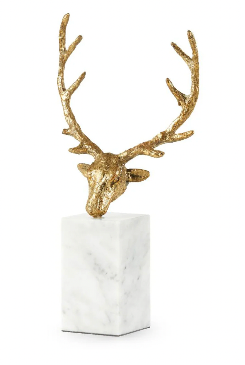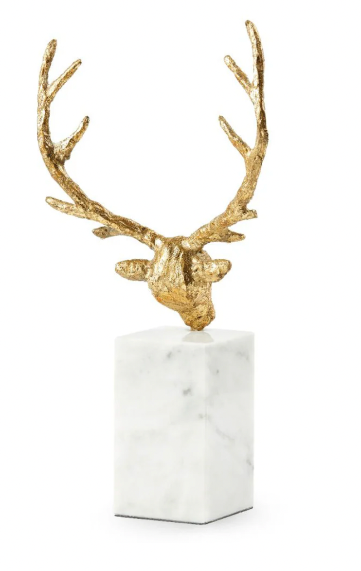 The Hart Statue is sand cast in metal, hand leafed in gold, and then mounted on a glossy solid white marble base. It is a totemic bookend or decorative item which is reminiscent of early abstract animal carvings or the famous cave-wall-paintings in France. A set of two Hart Statues makes for striking bookends on an open etagere, or for beautiful decorative accessories balancing either side of an entryway console or on a sideboard.