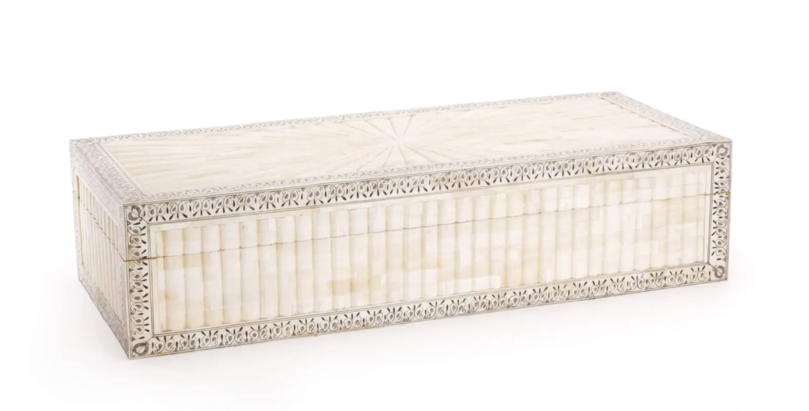 The Maharajah Bone Case brings timeless elegance to any space with its refined craftsmanship. This substantial storage piece features intricate bone inlay work that catches the light beautifully, making it as much a decorative accent as a functional organizer. Perfect for displaying treasured collections, storing jewelry, or adding a touch of global sophistication to shelves and tables. Its generous 26" width provides ample room while maintaining a graceful profile that complements both traditional and contemporary interiors.
