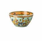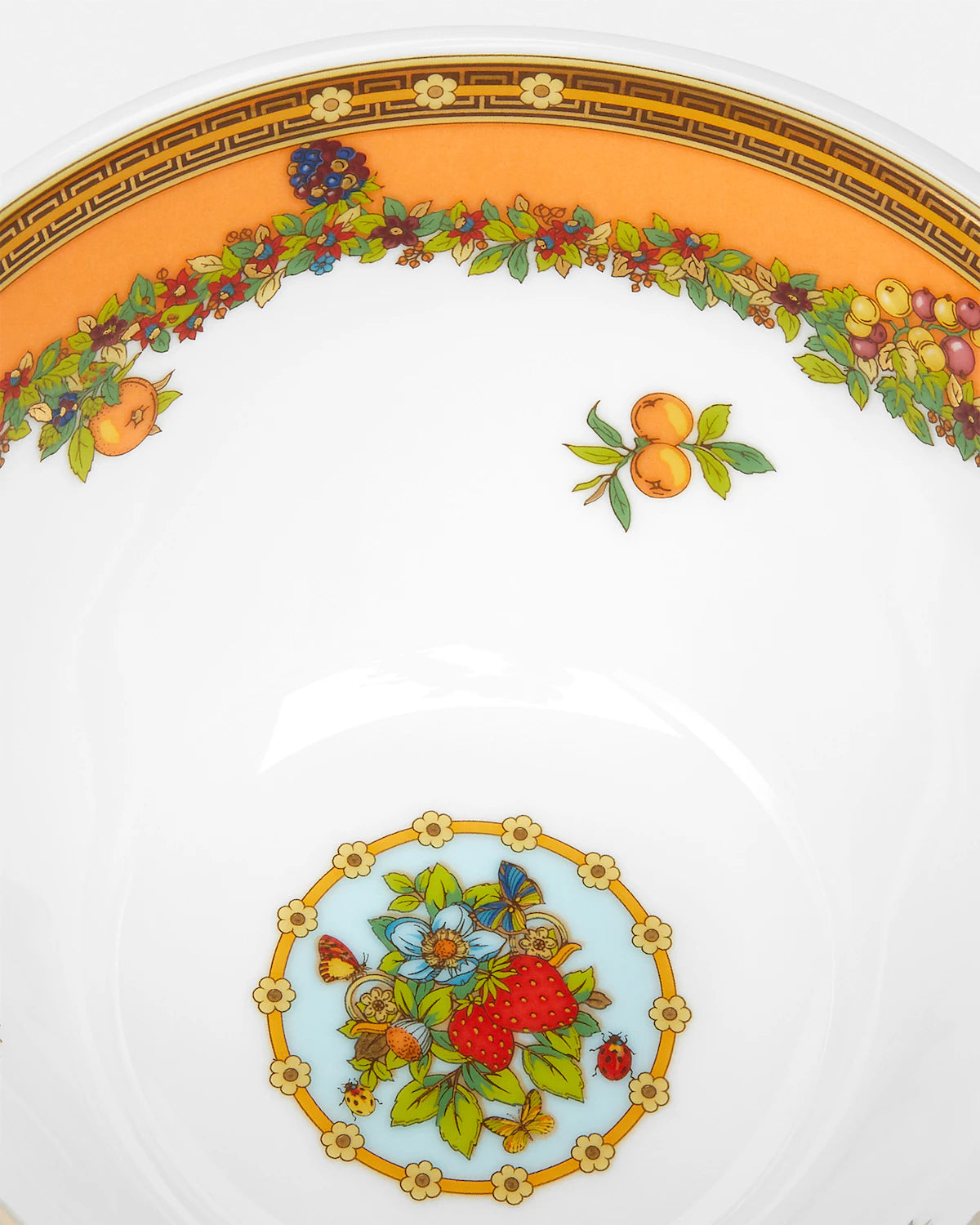 A small porcelain nesting bowl featuring the Le Jardin de Versace design, depicting natural elements like blossoms, berries, insects in delicate pastel shades all framed by a gold-tone Greca border. To complete the set this item can be paired with the lid and bowls from the same line, which can be stored to fit one inside another.