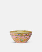 A porcelain nesting bowl featuring the Le Jardin de Versace design, depicting natural elements like blossoms, berries, insects in delicate pastel shades, all framed by a gold-tone Greca border. To complete the set this item can be paired with the lid and bowls from the same line, which can be stored to fit one inside another.