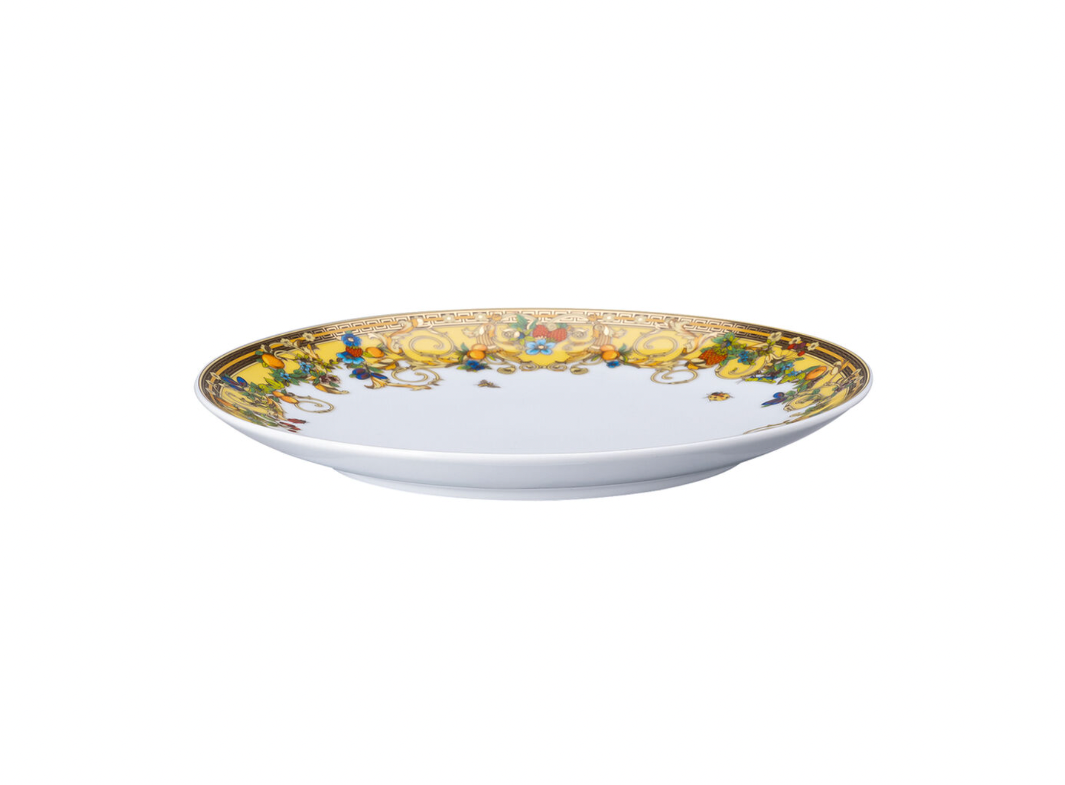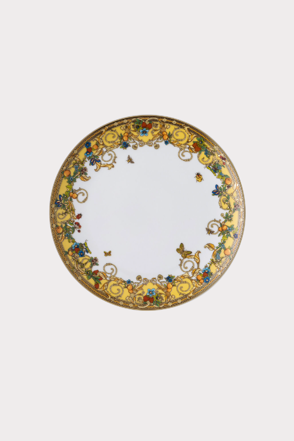 A porcelain plate featuring the pastel tones and natural elements of the Le Jardin de Versace collection accented with a delicate Greca border. The dinner plate can be used with its matching deep plate to complete the dining arrangement.