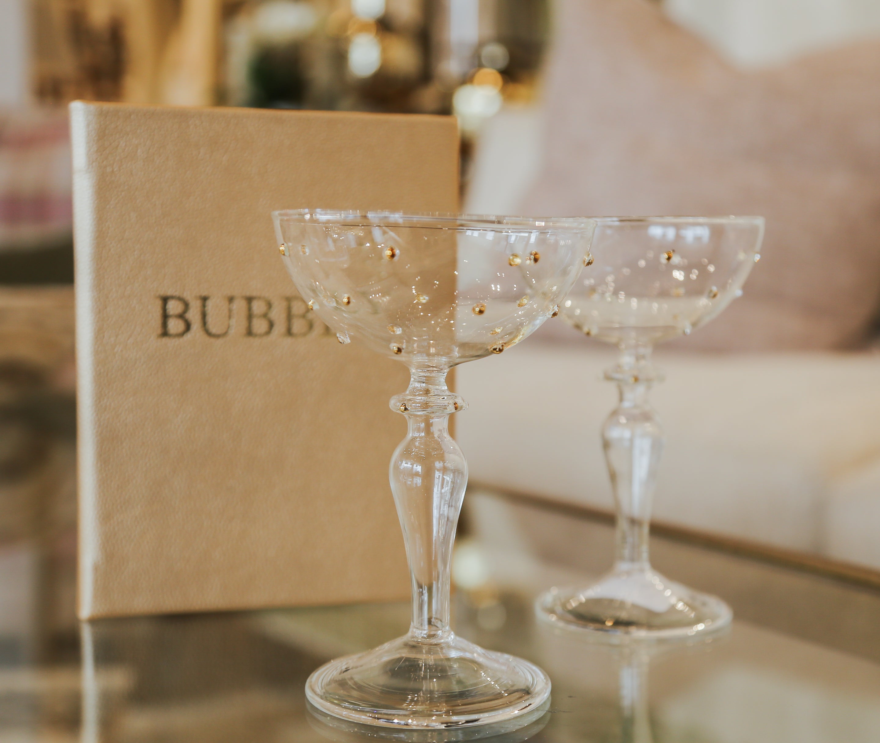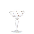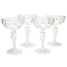 The stemmed coupe for champagne was a very popular glass during the "Roaring Twenties". Gatsby himself would have enjoyed these. Try them for your next Gatsby party. Tiny glass dots of gold make that special appeal. Hand wash to protect the gold. Set of 4.