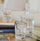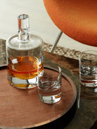 A cylindrical decanter and pair of tumblers with exceptionally heavy bases, mouth blown by master glassblowers.