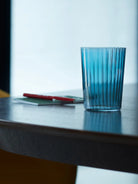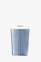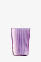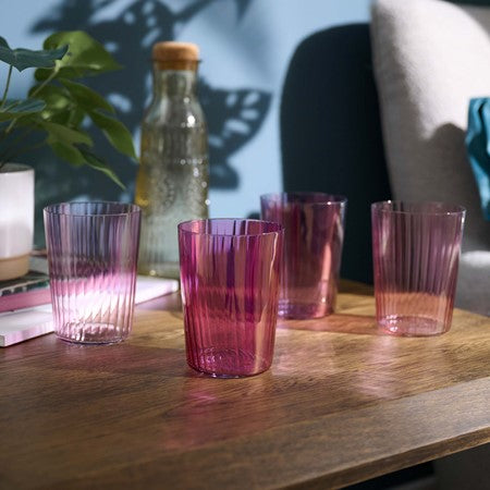 Four tall, fine-walled glasses with a fluted texture. Hand painted in assorted sheer lustres of the same tone, inspired by the colour of semi-precious gems.