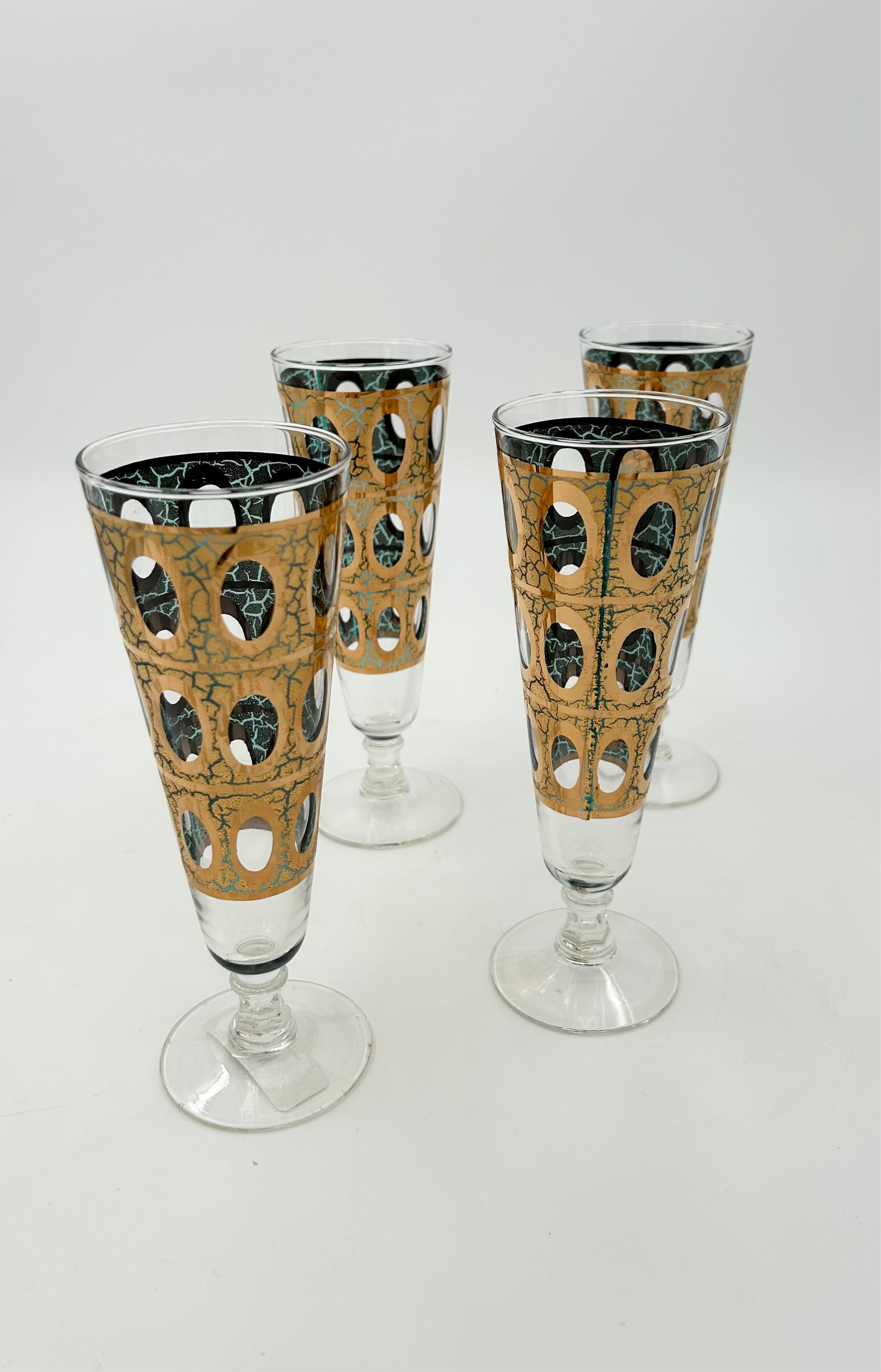 Elevate your entertaining with this rare Vintage Culver Glass Pisa Pilsner Set from 1964-1965. This complete set of four features elegant mid-century design, showcasing clear glass with distinctive gold detailing that adds timeless sophistication to any bar or table. Perfect for collectors or those who appreciate refined craftsmanship, these pilsner glasses combine vintage charm with functional style, enhancing every sip with a touch of classic elegance.