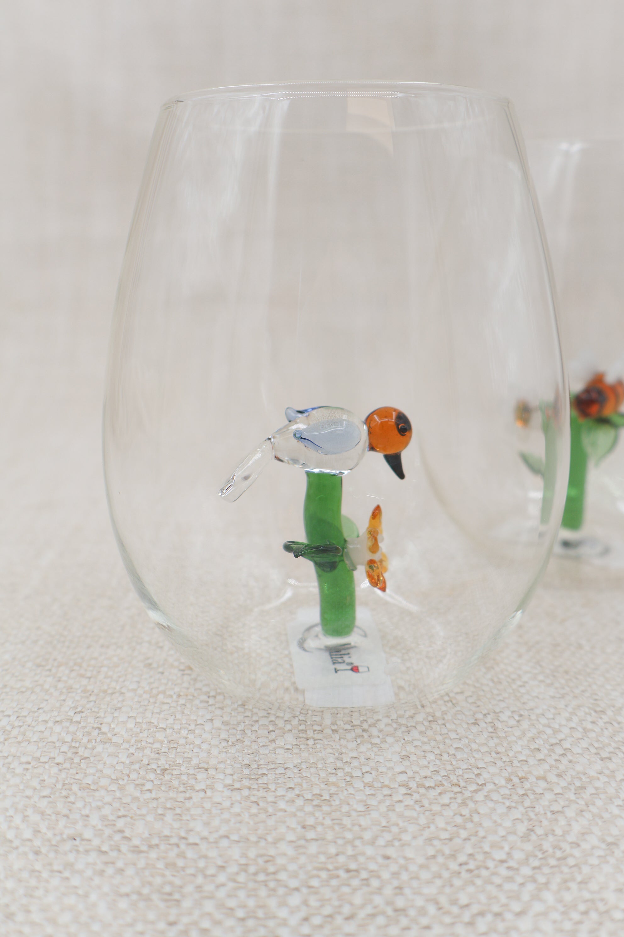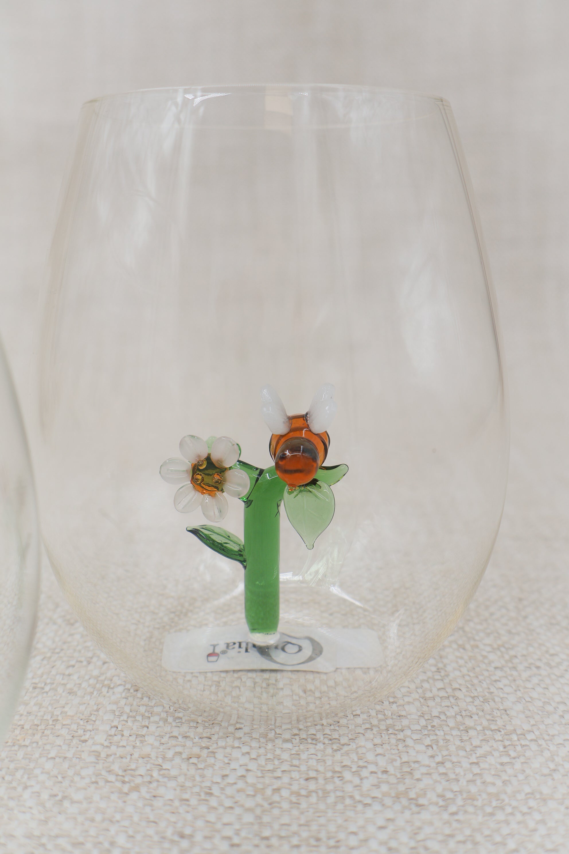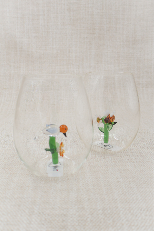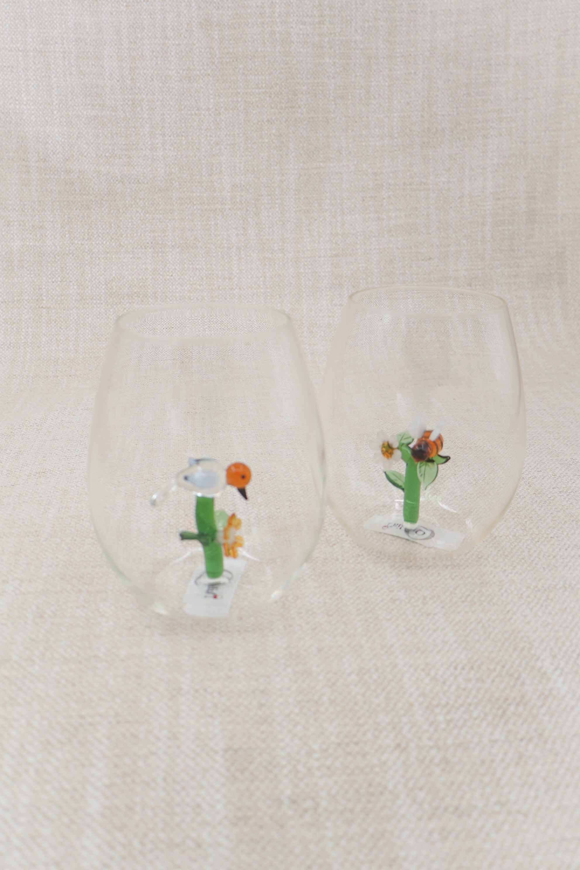 Indulge in the delicate beauty of nature with our Botanical Stemless Wine Glass. Choose from a charming bumblebee or a graceful hummingbird design. Enhance your drinking experience with these elegant glassware, while admiring the intricate detail of these exquisite creatures. Enjoy your favorite wines in style.