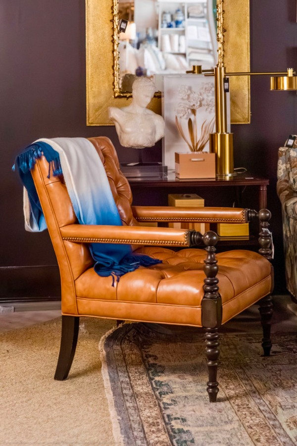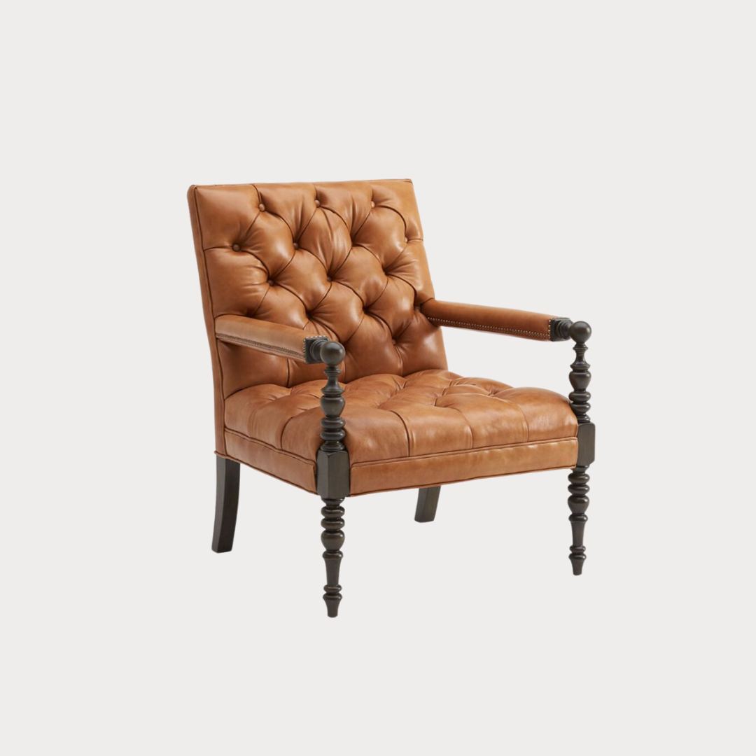 Deep button tufting in the seat and back offers exceptional comfort. Turned posts on the arms and legs. Note the outline of nailhead trim on the sides of the upholstered arms. Beauty is in the details.