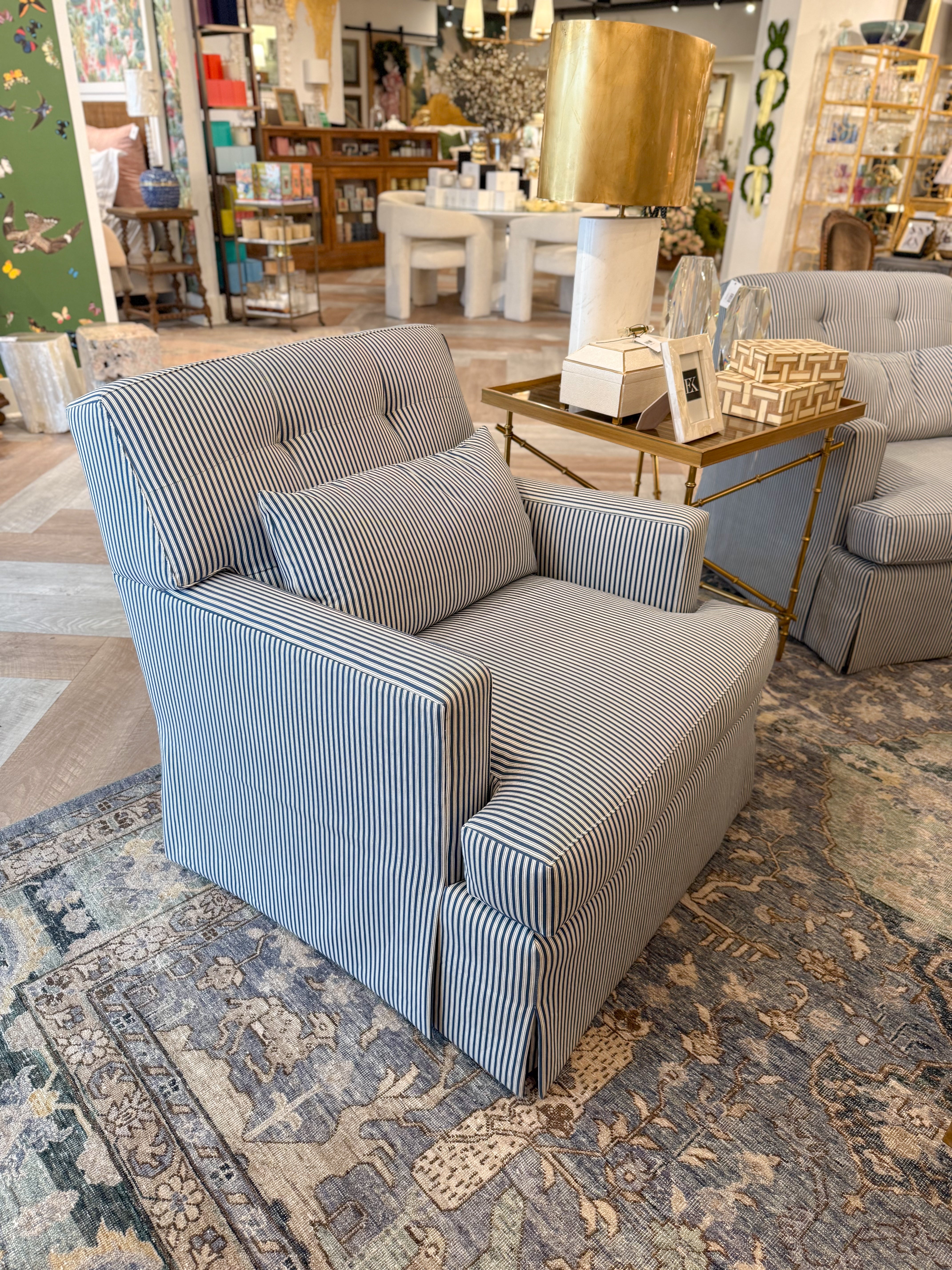 The Leola Skirted Chair by Alexa Hampton has a contemporary, yet familiar design. From it's T Cushion seat and square arm combination, paired with a tufted boxed back and front skirt, this chair completes the look in any room.