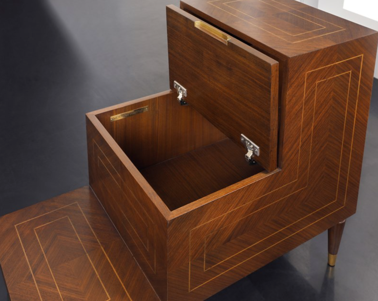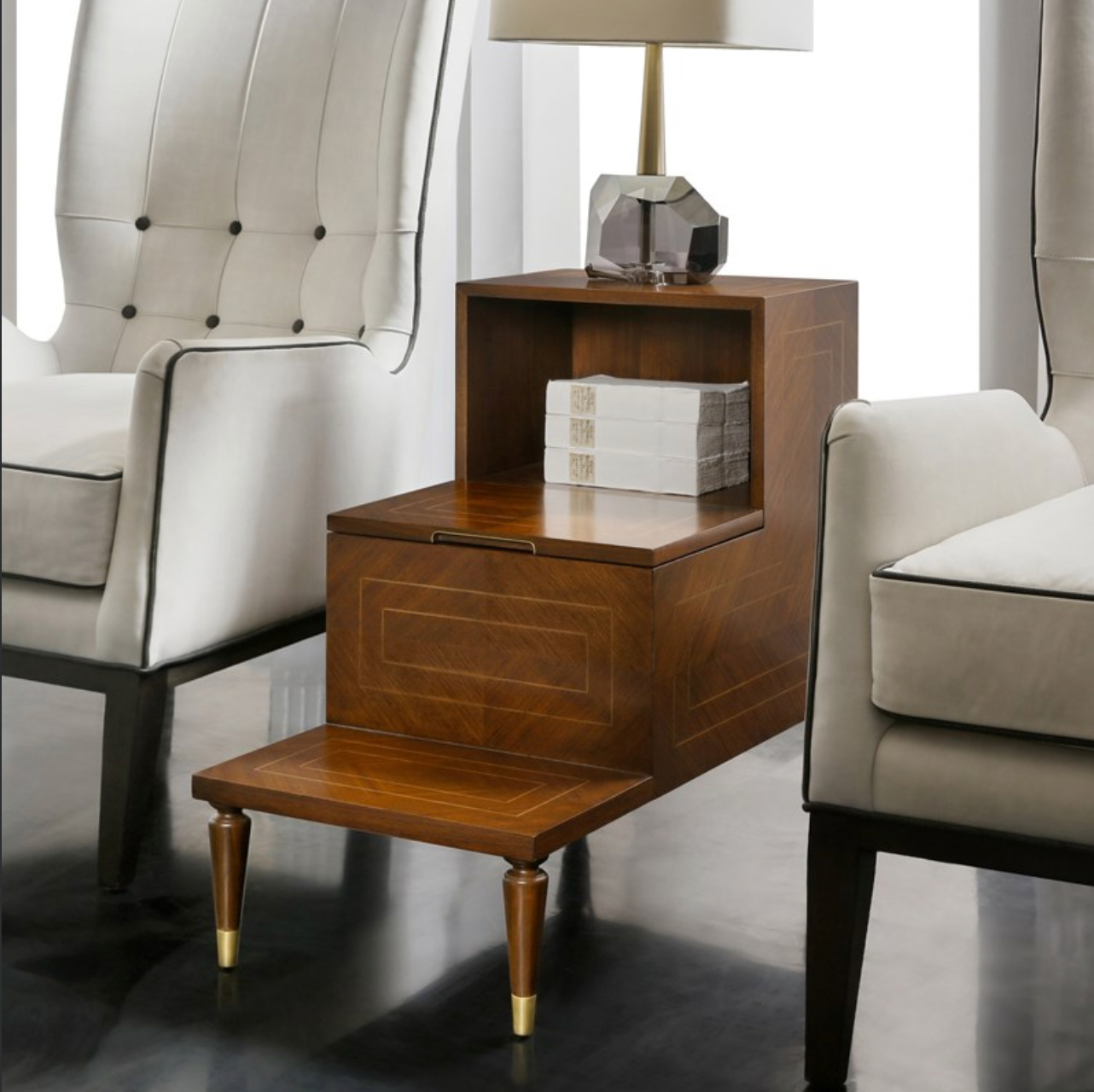 Elevate your reading nook with this charming Library Tier End Table, where function meets timeless elegance. Crafted with rich walnut veneer and adorned with delicate satinwood inlay, this piece brings warmth and sophistication to any room. The soft-close hinge storage compartment—finished with gleaming brass accents—keeps your favorite books, blankets, or treasures within arm's reach while adding a touch of vintage charm. Perfect for those who appreciate quality craftsmanship and a little extra storage magic.
