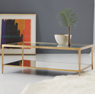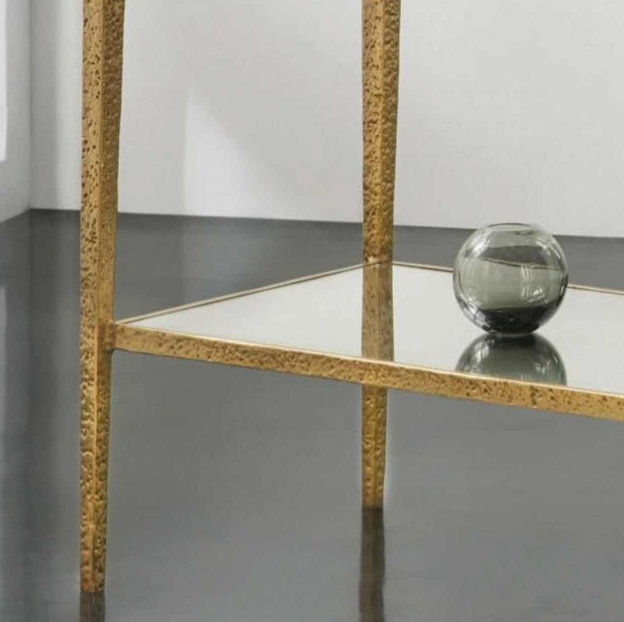 This architectural coffee table commands attention with its sculptural textured brass frame finished in warm gold tones. The antique mirror glass top reflects light and space, creating visual intrigue while the clear glass surface provides practical functionality. Measuring 54 inches wide by 28 inches deep and standing at a comfortable 18.75 inches high, it anchors any seating arrangement with understated luxury. An investment piece that transforms your living room into a gallery-worthy space.