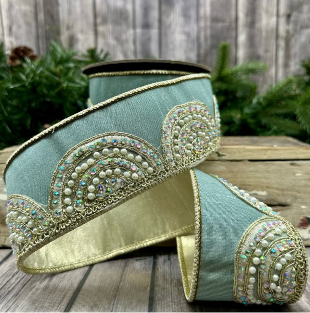 25-2.5"x5yds Dupion Scallop Iridescent Pearl Trim, Gold Metallic Dupion, Aqua