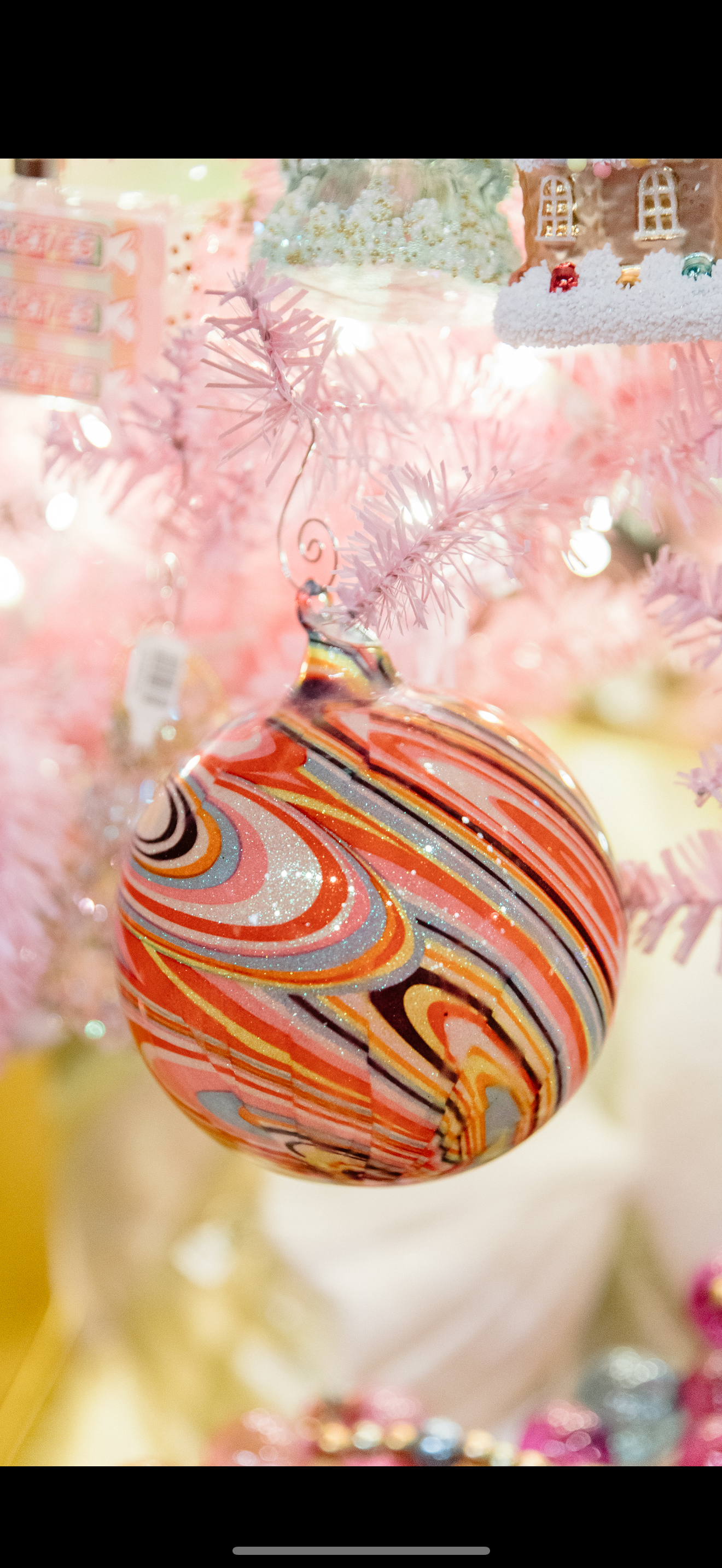 Add a burst of festive fun with the Jim Marvin 120 mm glass glitter ball ornament. This collectible piece sparkles with multicolor glitter, bringing playful charm and vibrant color to your holiday decorations. Perfect for brightening up your tree or adding to your ornament collection!