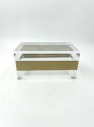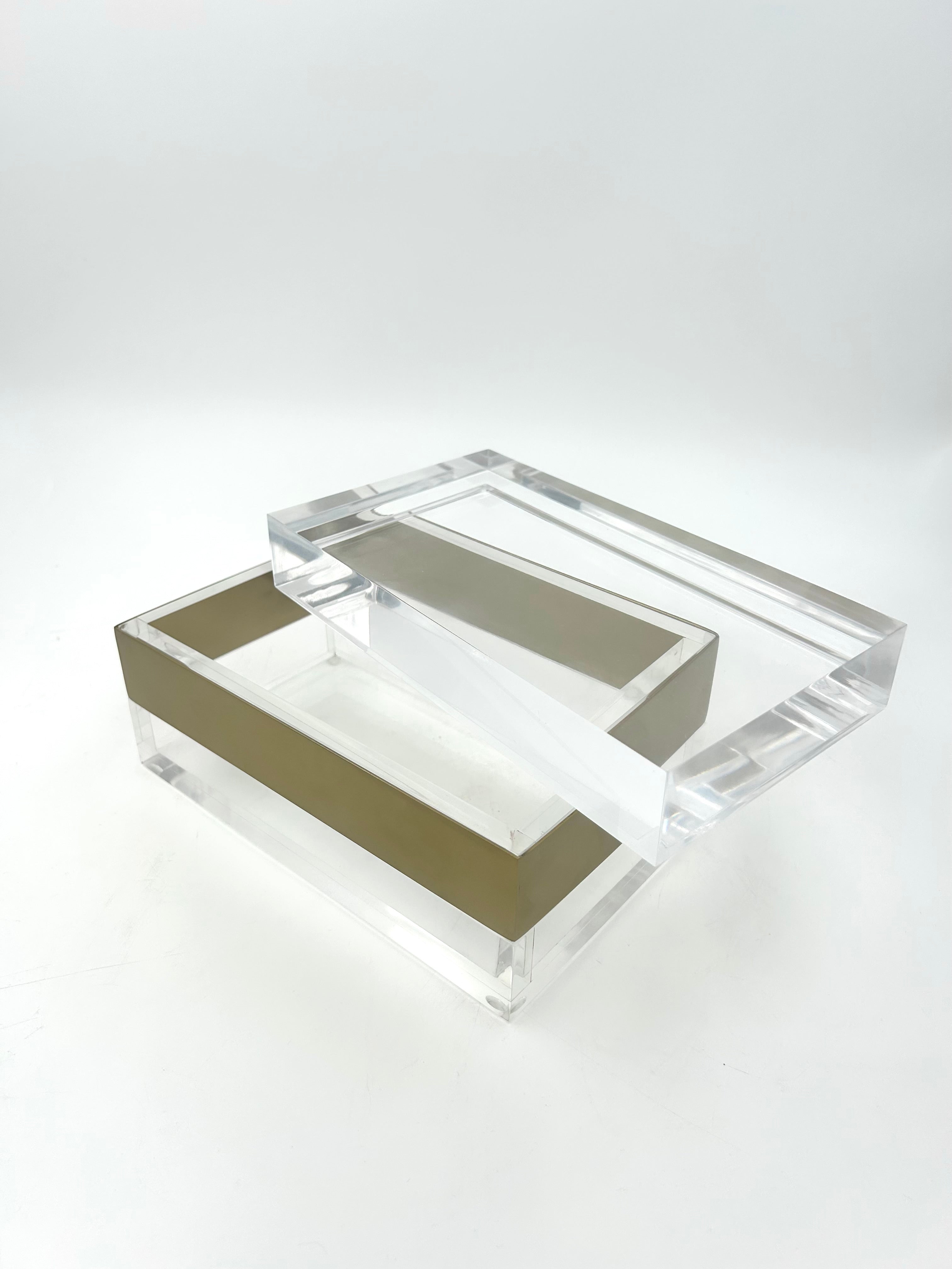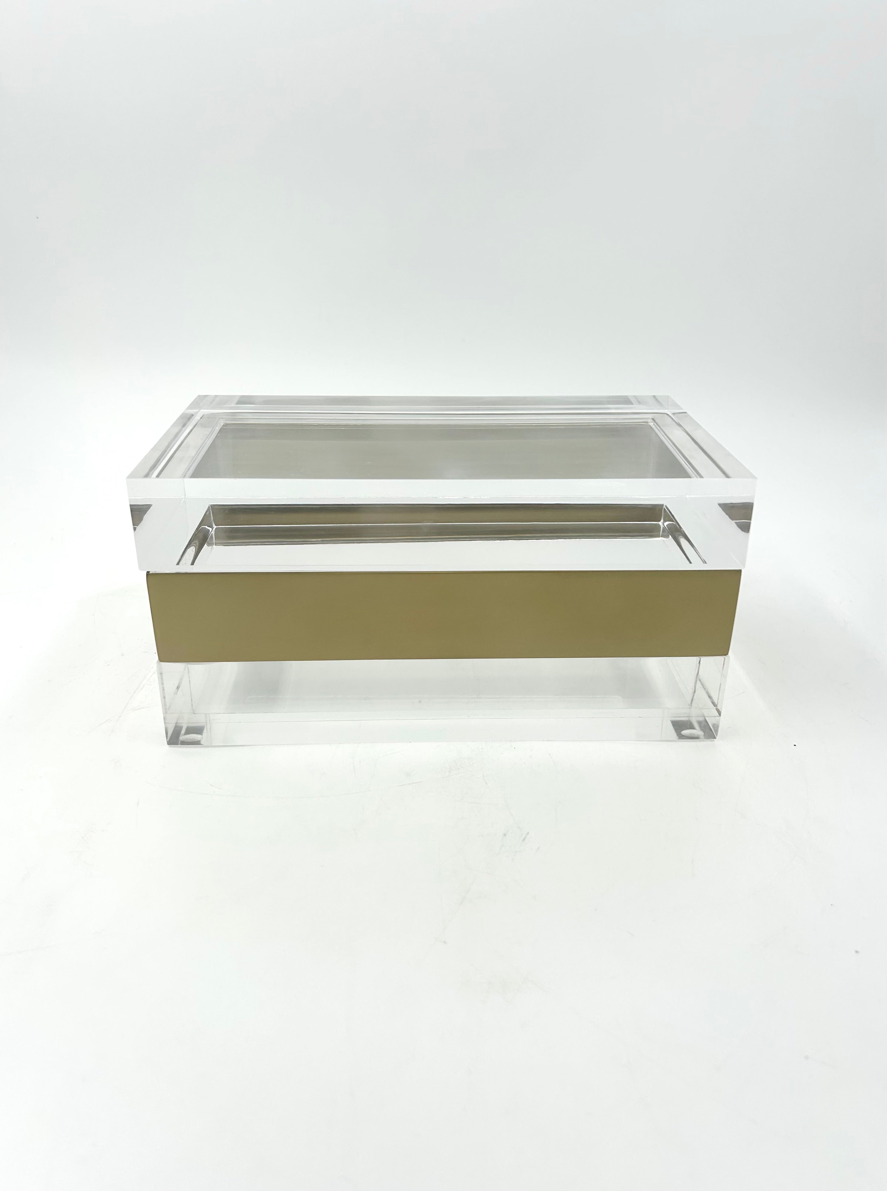 Display your most treasured items with understated elegance. This clear acrylic box features warm gold accents that catch the light beautifully, creating a refined storage solution for jewelry, keepsakes, or decorative objects. The transparent design showcases contents while the gold detailing adds a touch of luxury. Perfect for adding a polished accent to any room's décor.