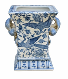 This 9" square cachepot features a blue and white antique-style porcelain design accented with pomegranate motifs, offering an elegant touch to any space.