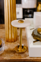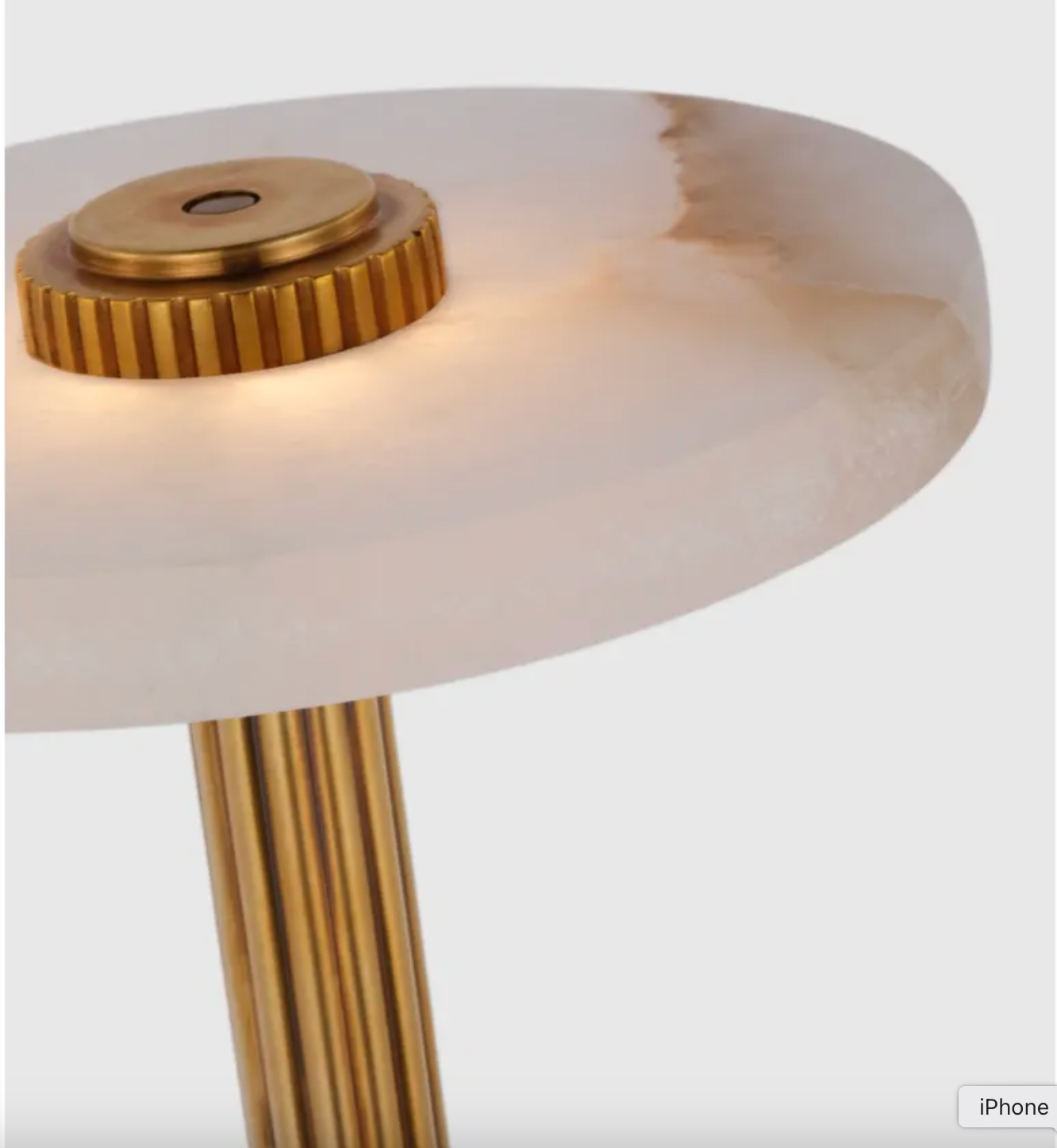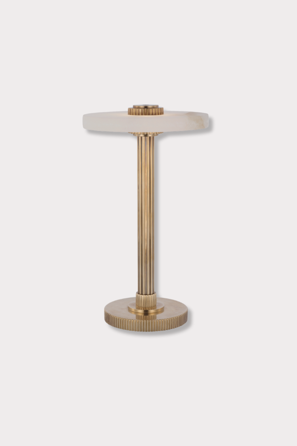 Introducing the Aran Rechargeable Lamp. With a sleek marble top and elegant gold fluted base, this lamp not only provides stylish lighting but also offers convenience with its rechargeable feature. No need to search for outlets, the charger is included for your convenience.