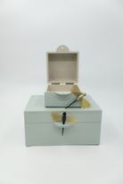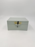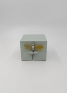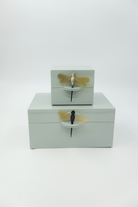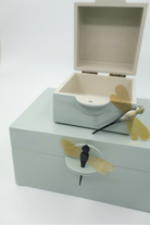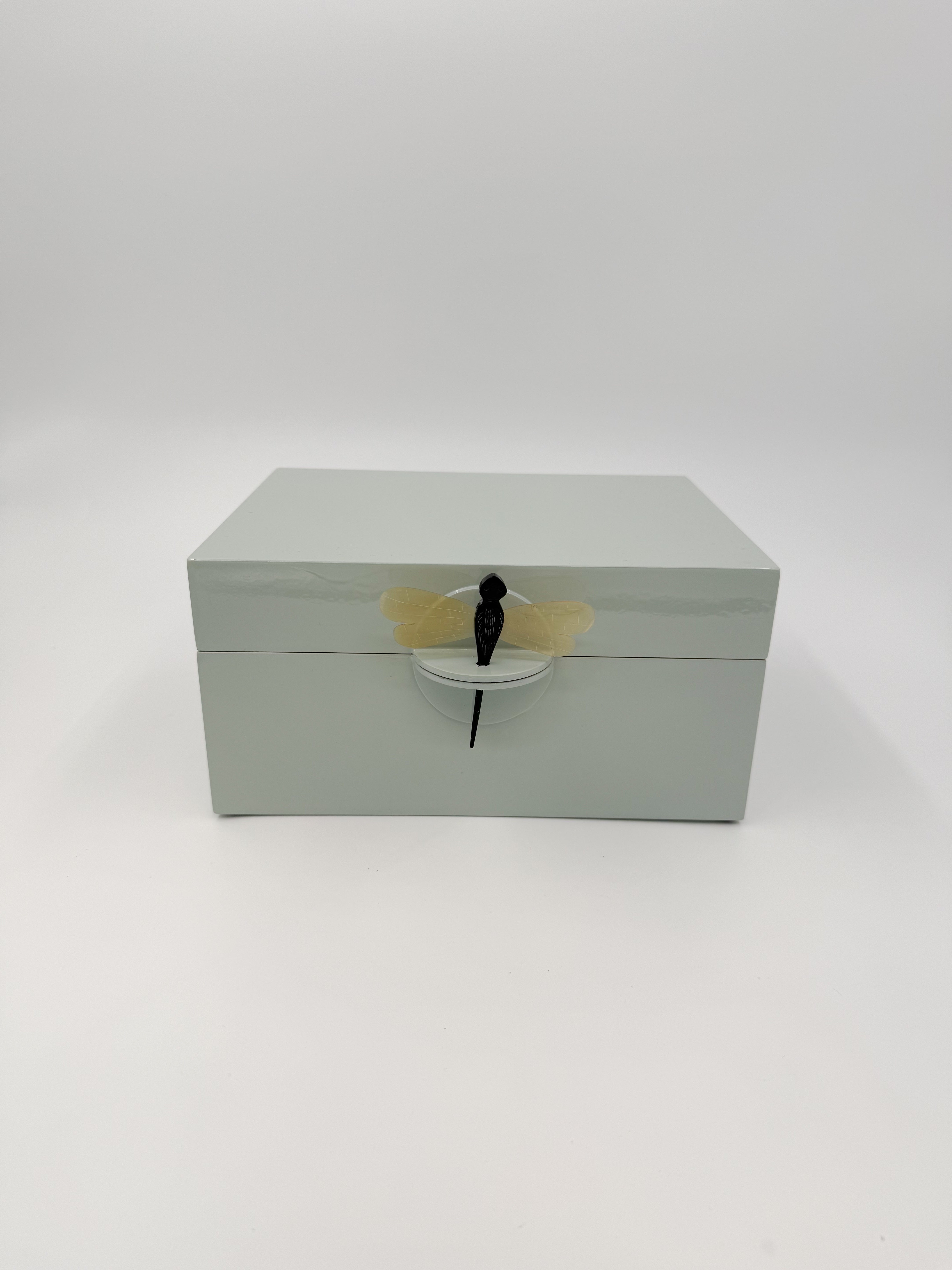 Each box in this collection is made with MDF wood covered in 13-15 layers of lacquer with a dragonfly pin closure with buffalo horn.