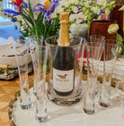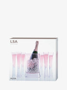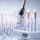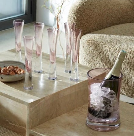 A mouth-blown glass champagne serving set. Each flute's fine bowl and thick, flared stem is mouth blown as one piece of glass. The ice bucket has a complementary curved design. The subtle pink tint is inspired by the colour of rose champagne. Handwash in warm soapy water and dry with a soft cloth.