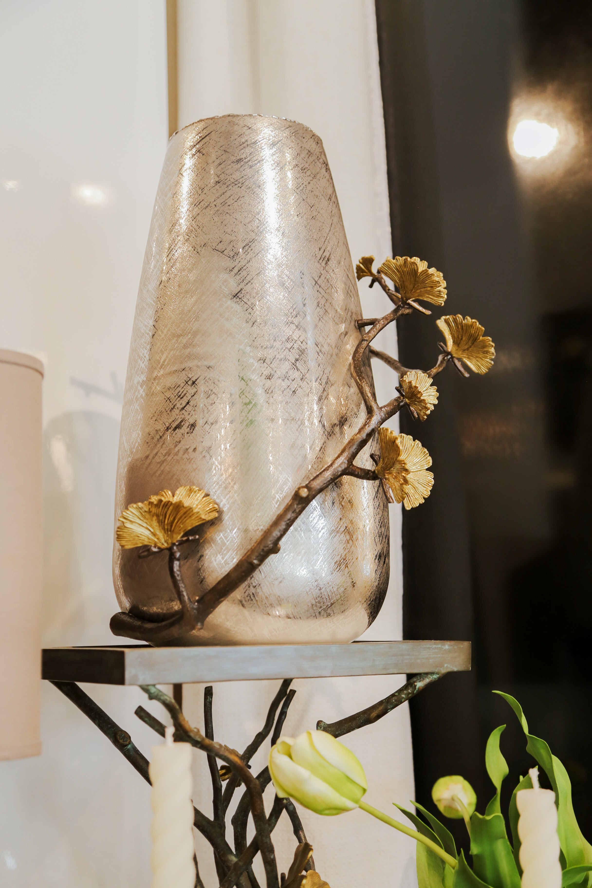 The Butterfly Ginkgo Collection by Michael Aram celebrates the representation of flora as fauna. Michael's fascination with a particular type of ginkgo tree, the Ginkgo Biloba, or "Butterfly Ginkgo", which grows with a double leaf reminiscent of a butterfly's wings, gave rise to a fantasia image of the plant. Executed at the highest level of handcraftsmanship, each piece is rendered in solid brass with hand-etched cocoon-shaped vessels. The pieces in the collection are a tour de force of the handcrafted process, capturing the poetic spirit that is so deeply indicative of Michael's work.