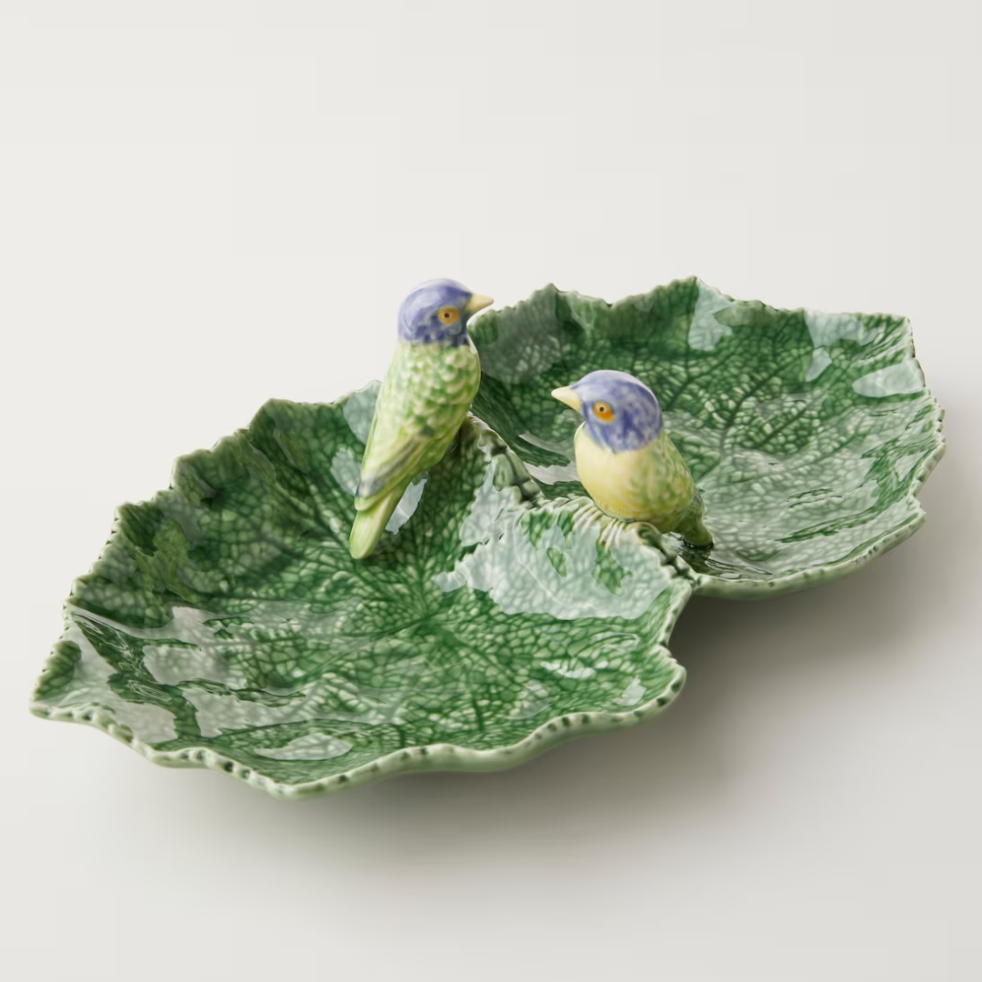Honoring both nature and wildlife is intrinsic to the story of Bordallo Pinheiro. Therefore, it comes as no surprise that one of the latest additions to the Portuguese brand's collection is the Cinerária series – a family of ceramic pieces that celebrate the cineraria plant via intricately detailed designs with a touch of whimsy, quirkiness, and color. This Double Leaf dish is ideal for storing small trinkets and is decorated with blue birds – a compelling detail that makes the dish equally suited to display when empty.