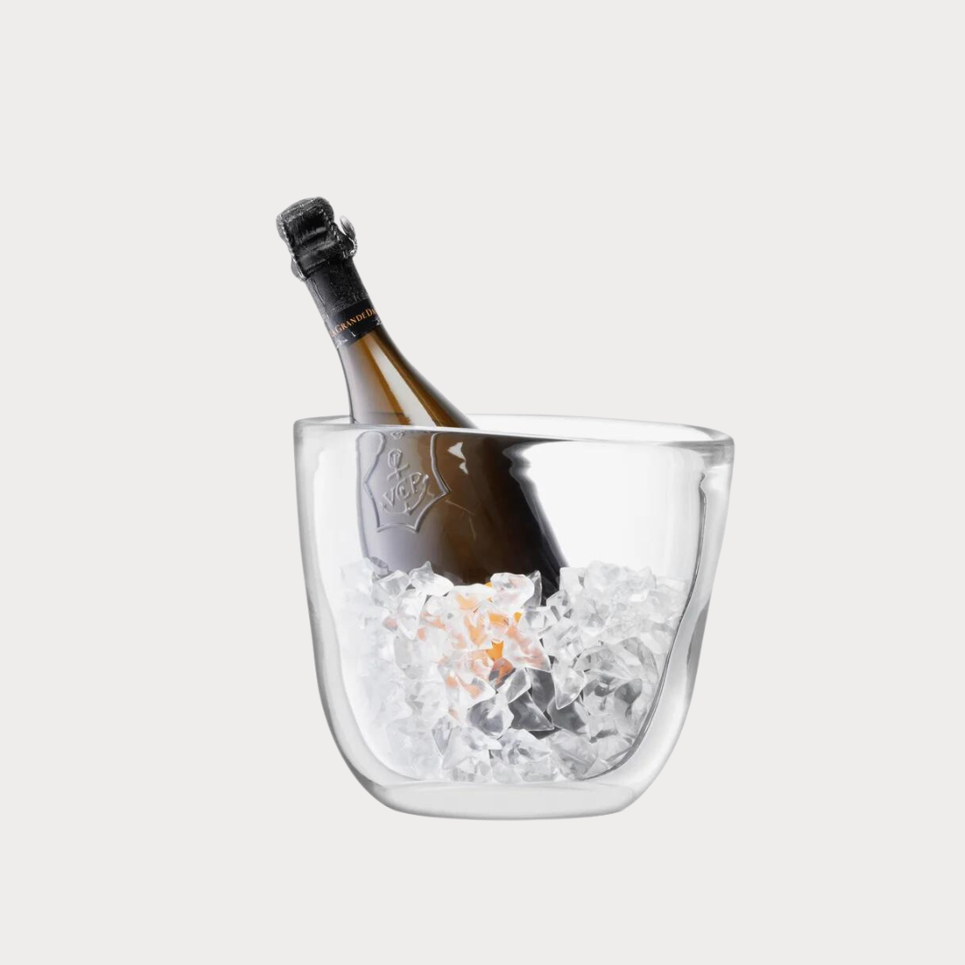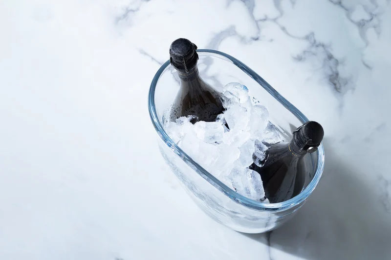 Organically-shaped dual champagne bucket with thick walls, mouth blown and hand formed by master glassblowers. For parties and celebrations. Versatile, for alternative use as a vase for big bunches of foliage or filled with citrus fruit.
