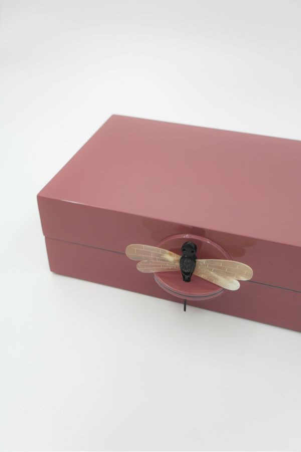Each box in this collection is made with MDF wood covered in 13-15 layers of lacquer with a dragonfly pin closure with buffalo horn.