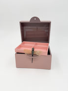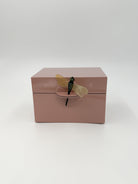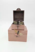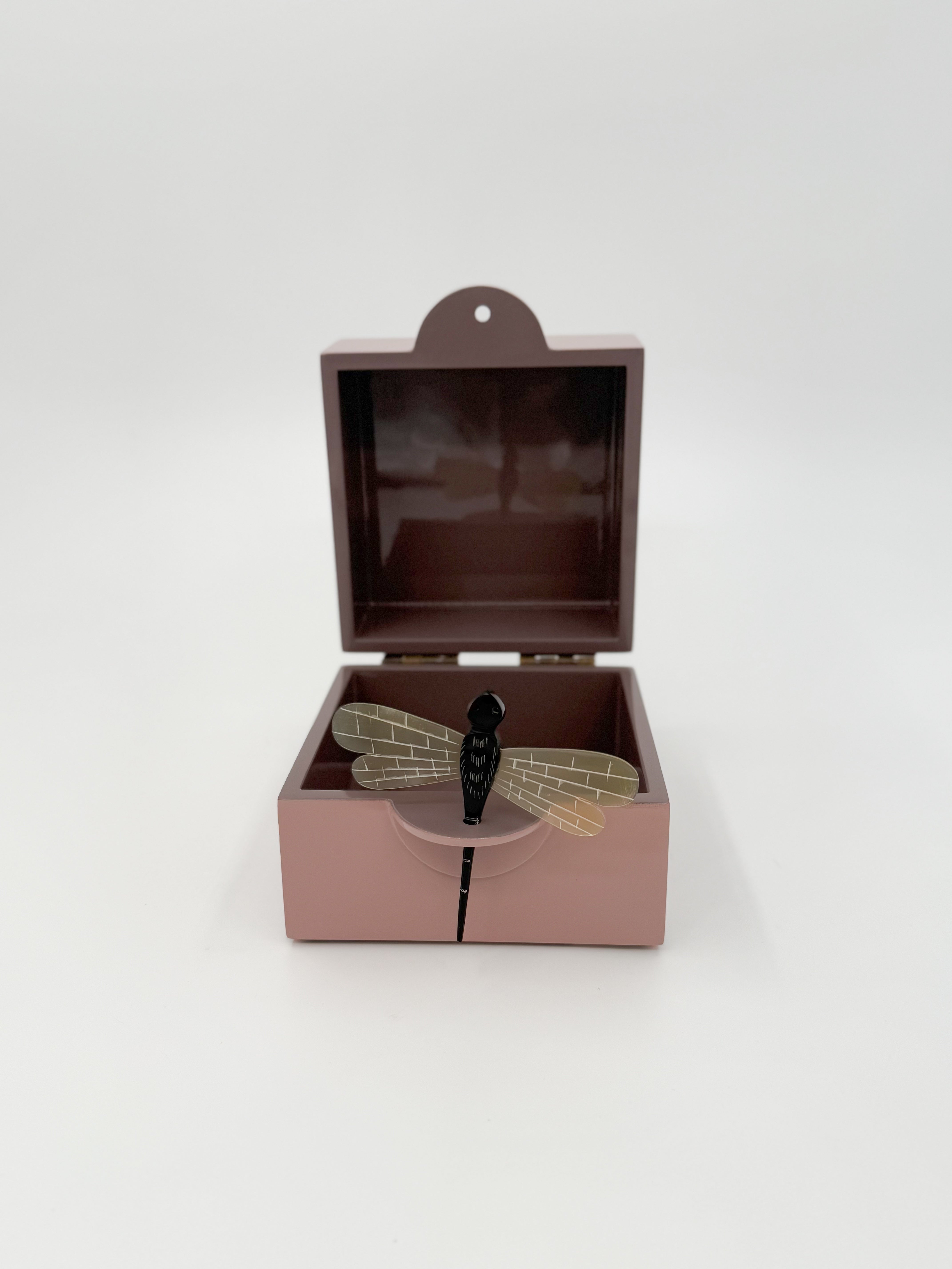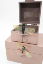 Each box in this collection is made with MDF wood covered in 13-15 layers of lacquer with a dragonfly pin closure with buffalo horn.