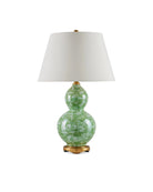 The name of the Eau de Nil Table Lamp was inspired by its pale green color, the sound as graceful as the design. Made of porcelain, the surface of the patterned double-gourd shaped body looks as if it is floating with clouds. The textured antique gold leaf on the metal and the wood base bring a warmth to the overall design. An empire shade is held in place by a matching gold finial.