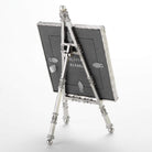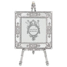 Cast pewter in silver finish with hundreds of hand-set clear Swarovski crystals amongst a mirrored backdrop. Gray moire silk back. Easel with hand-set clear Swarovski crystals and topped with a large faux pearl.