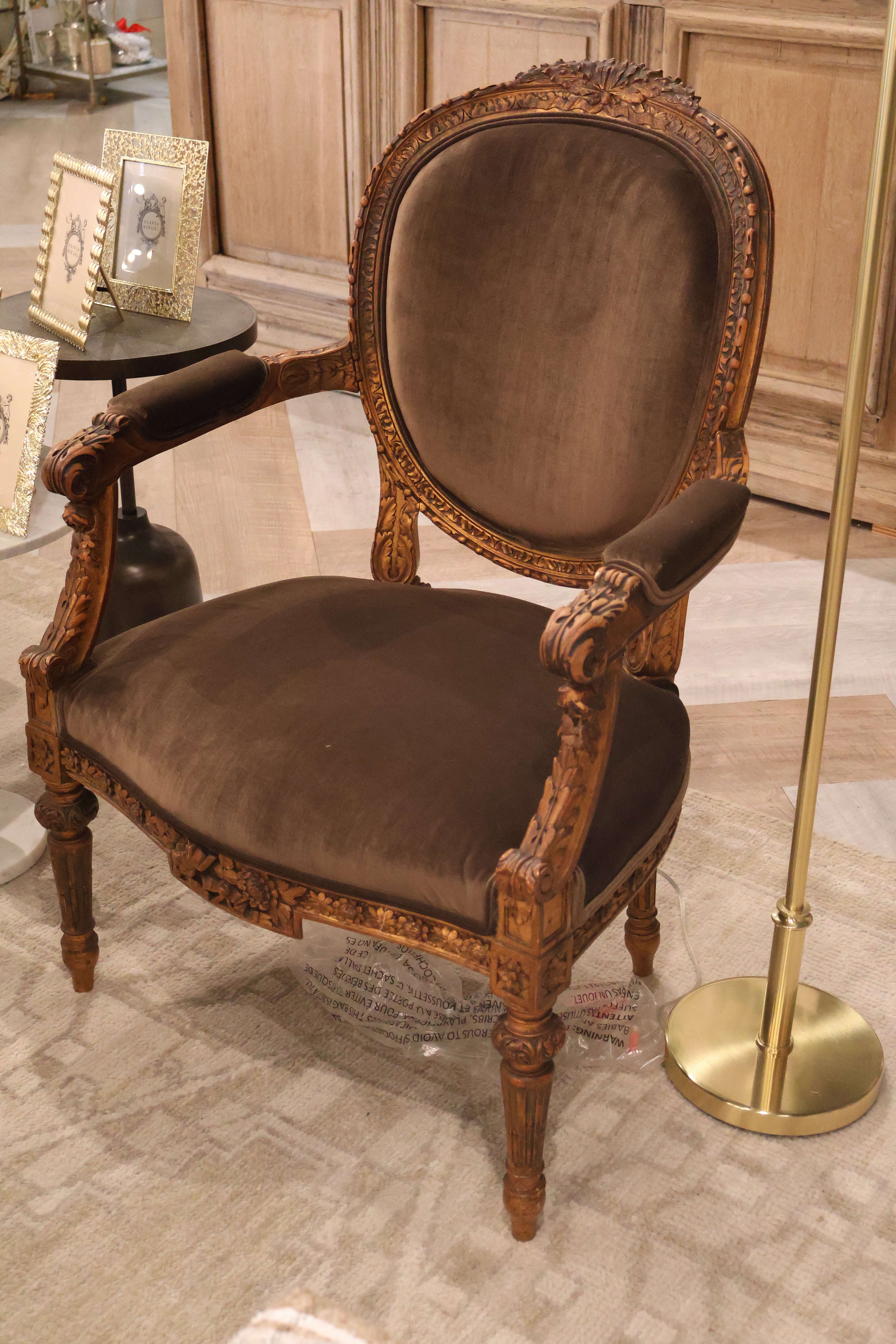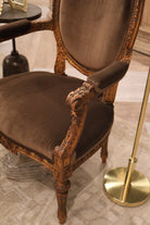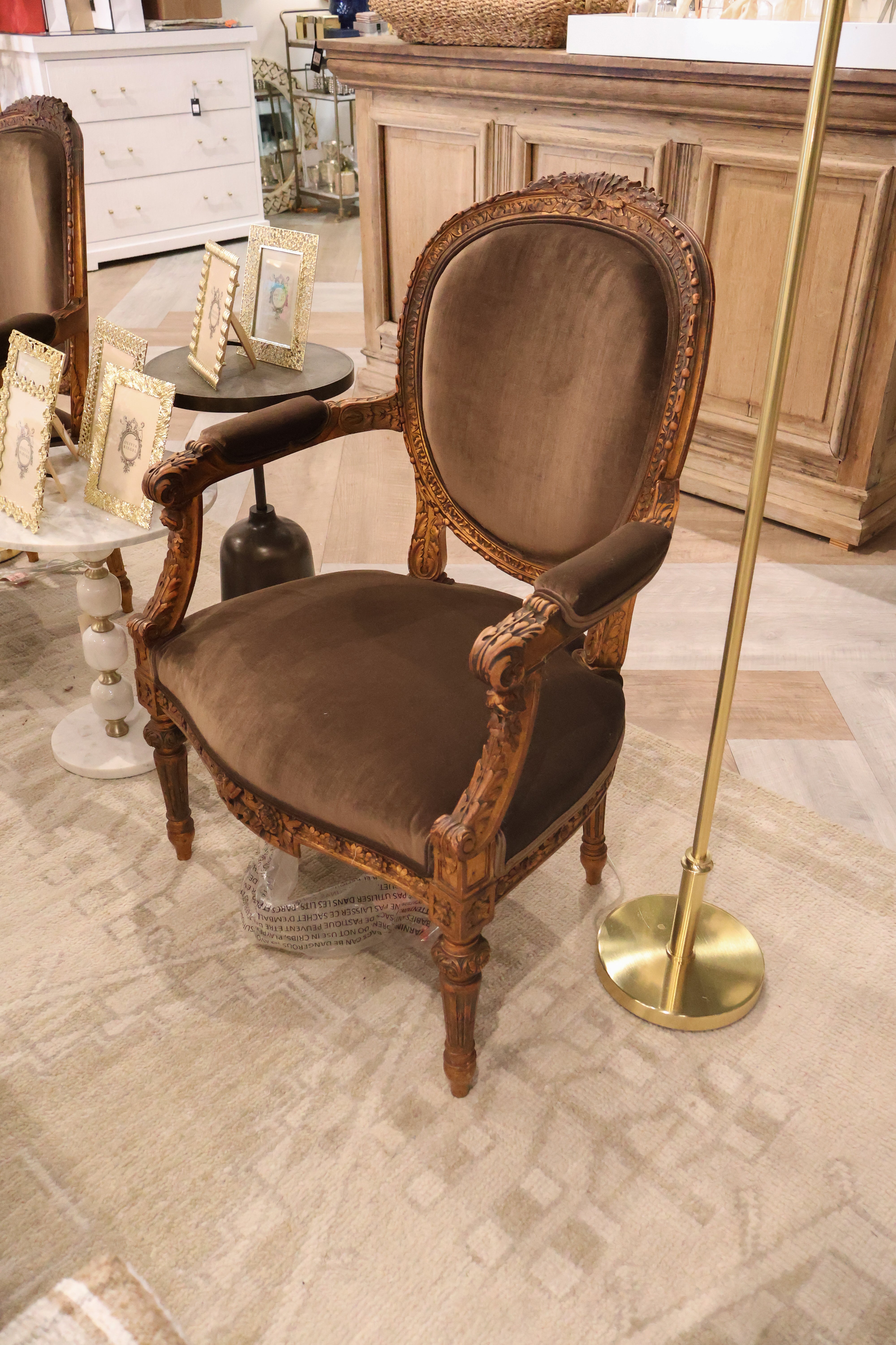 Elevate your space with the timeless elegance of this antique French fauteuil chair. The chair is upholstered in a rich brown velvet, offering a warm, tactile contrast to the intricate wood detailing. Both stylish and comfortable, this fauteuil makes a sophisticated statement in any interior—perfect for a cozy reading corner, elegant hallway, or refined living room.