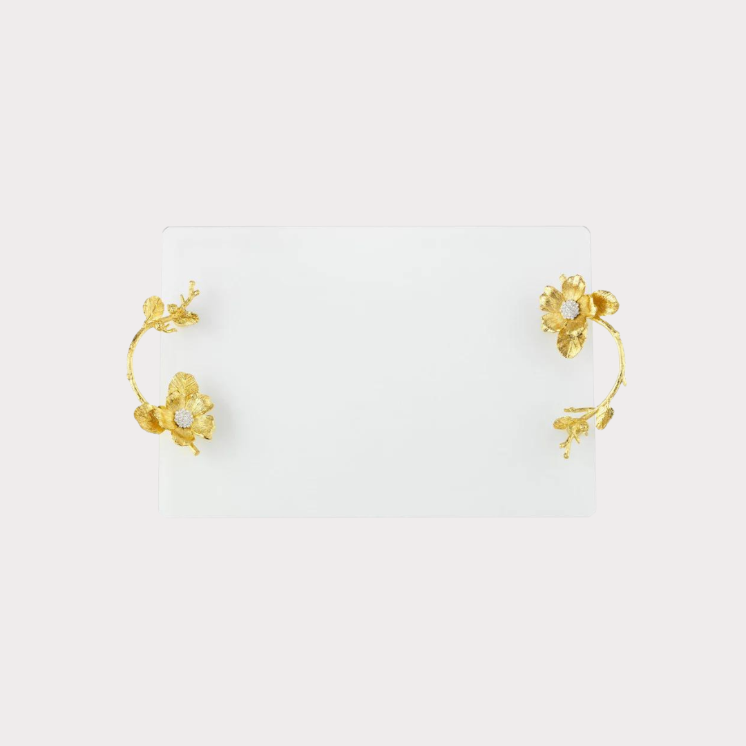 This footed clear glass tray is finished with painted pewter floral patterned handles inspired by the beautiful rugosa rose.