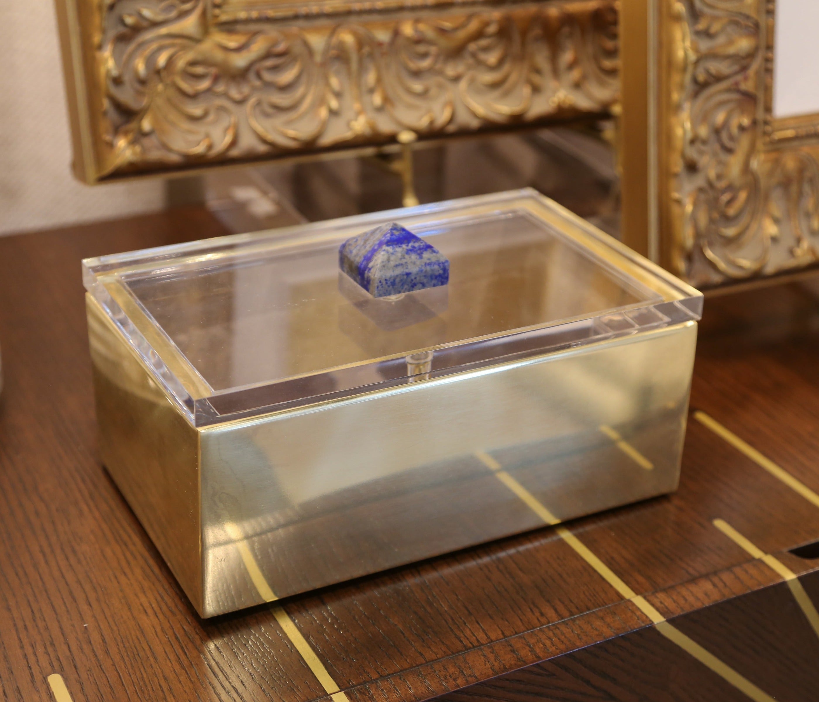 This elegant gold box features a transparent lucite lid, topped with a striking blue rock knob. Its refined design adds a touch of sophistication to any space while providing a stylish way to store and display your treasures. Perfect for elevating your home decor with a subtle blend of luxury and natural beauty.