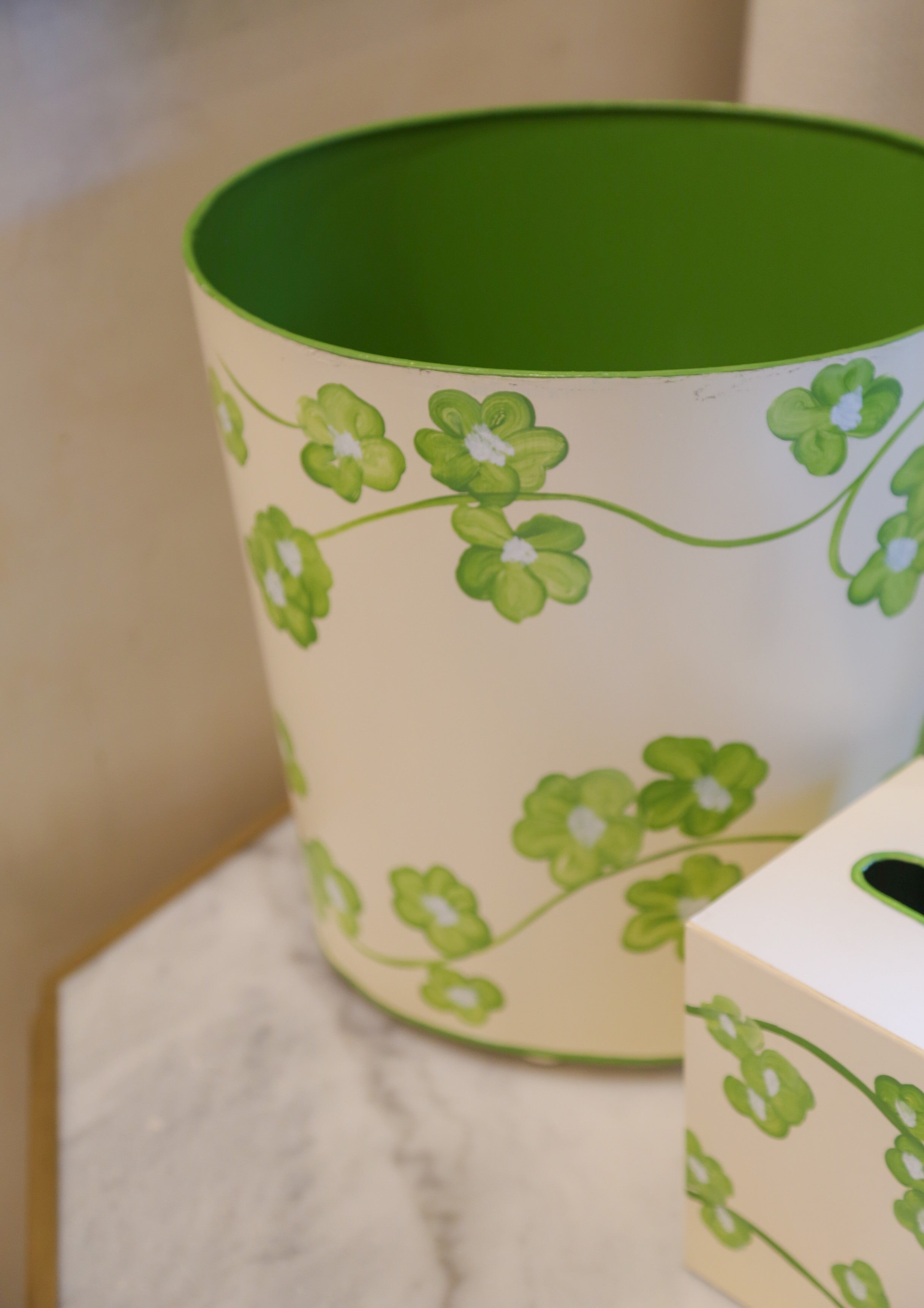 Add a touch of whimsy to your bathroom with the Green Hand Painted Bath Collection! Featuring a hand painted wastebasket and tissue box holder, this collection is adorned with a playful green floral motif on a cream background. The green interiors add an extra pop of color to brighten up your space.